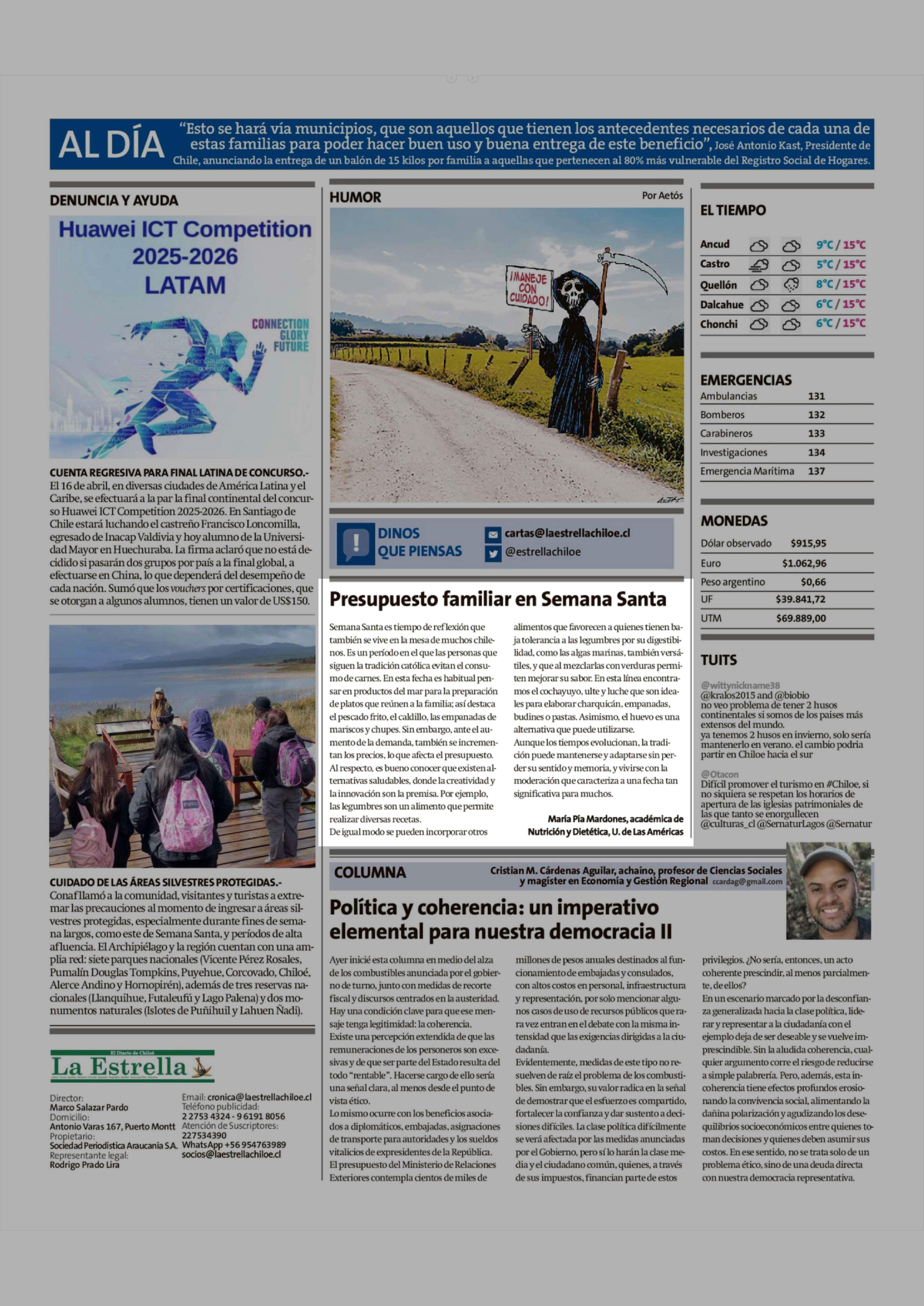 Cartas: Presupuesto familiar en Semana Santa 02-04-2026 La Estrella de Chiloé |