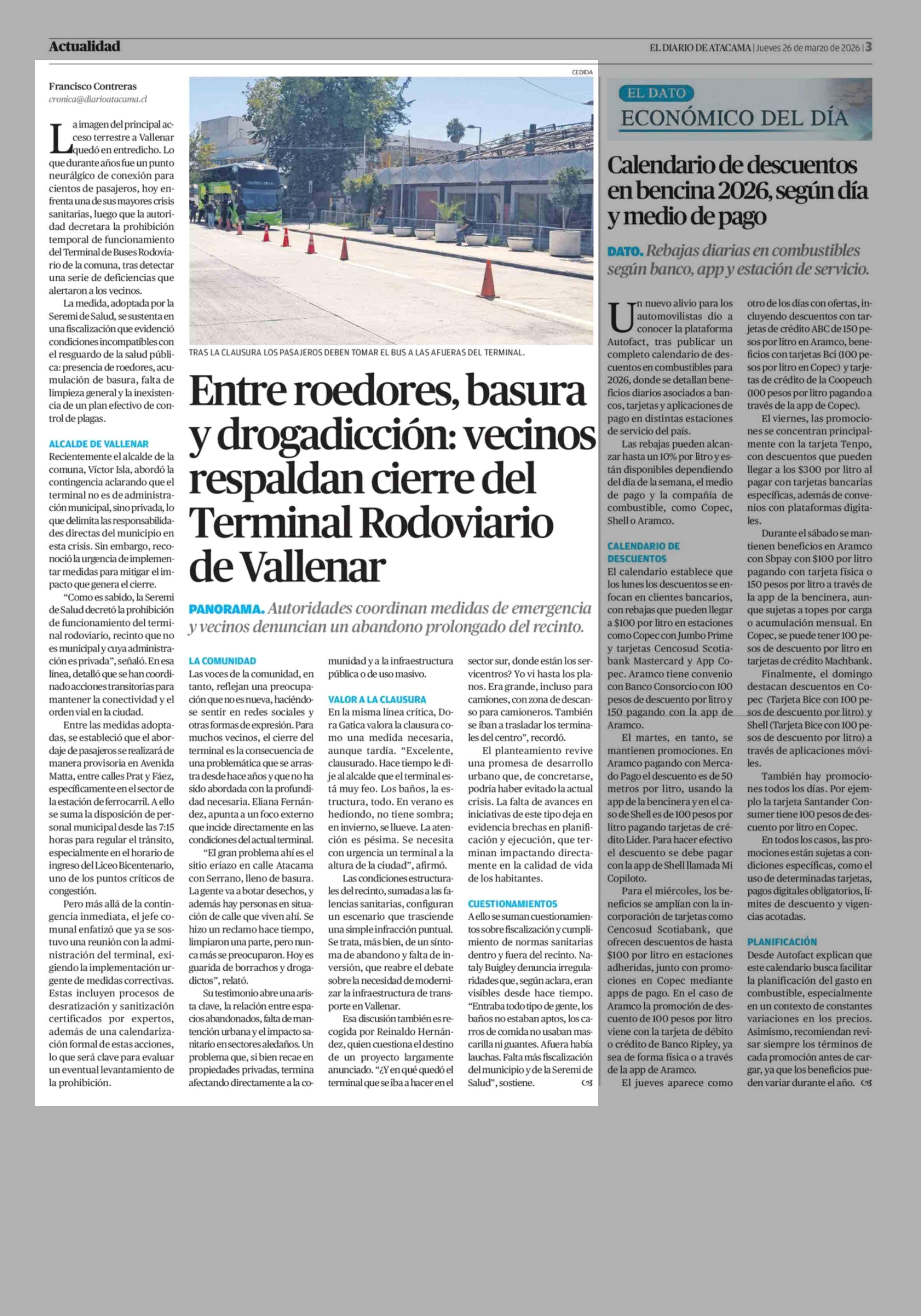 Entre roedores, basura y drogadicción: vecinos respaldan cierre del Terminal Rodoviario de Vallenar 26-03-2026 El Diario de Atacama |