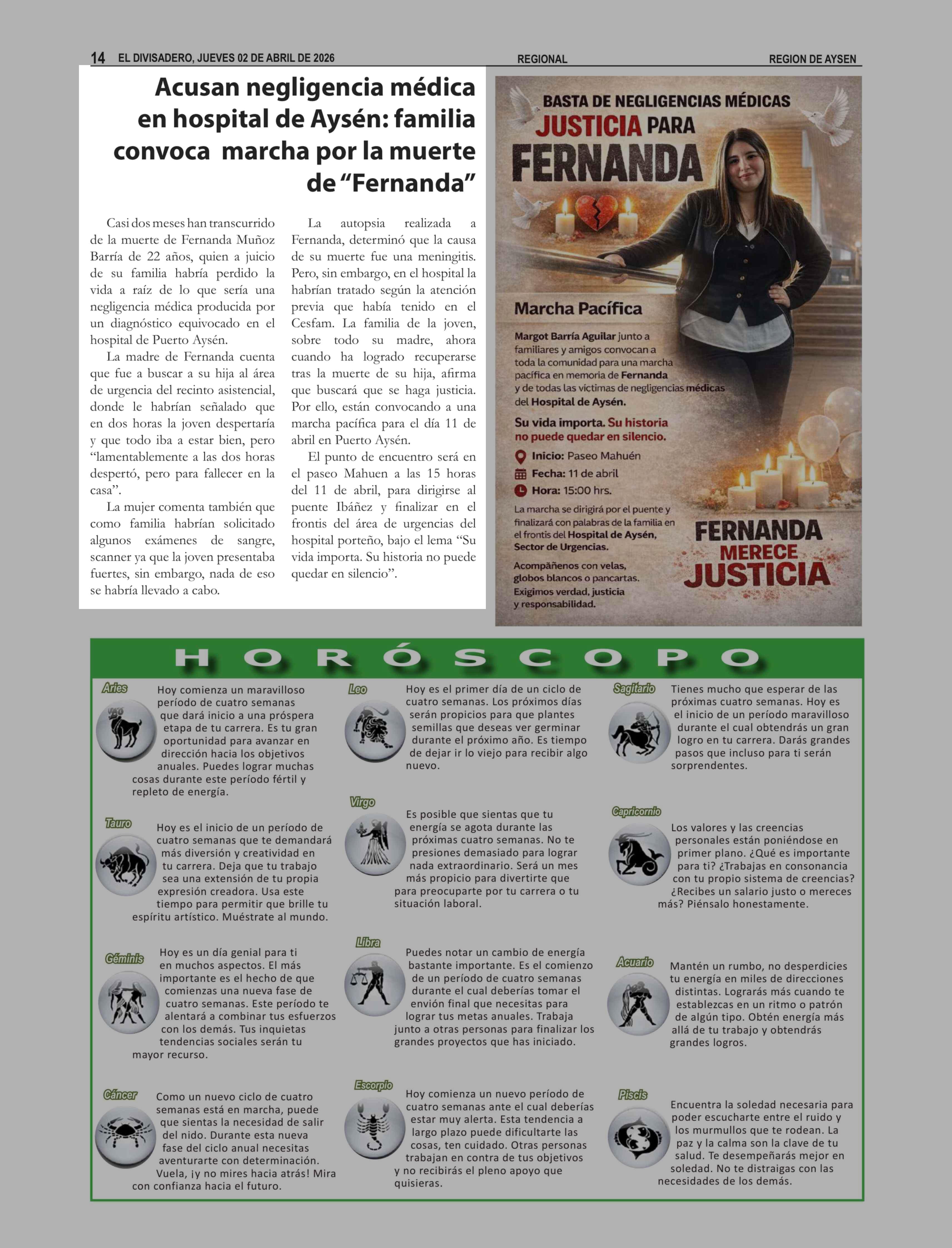 Acusan negligencia médica en hospital de Aysén: familia convoca marcha por la muerte de "Fernanda" 02-04-2026 El Divisadero |