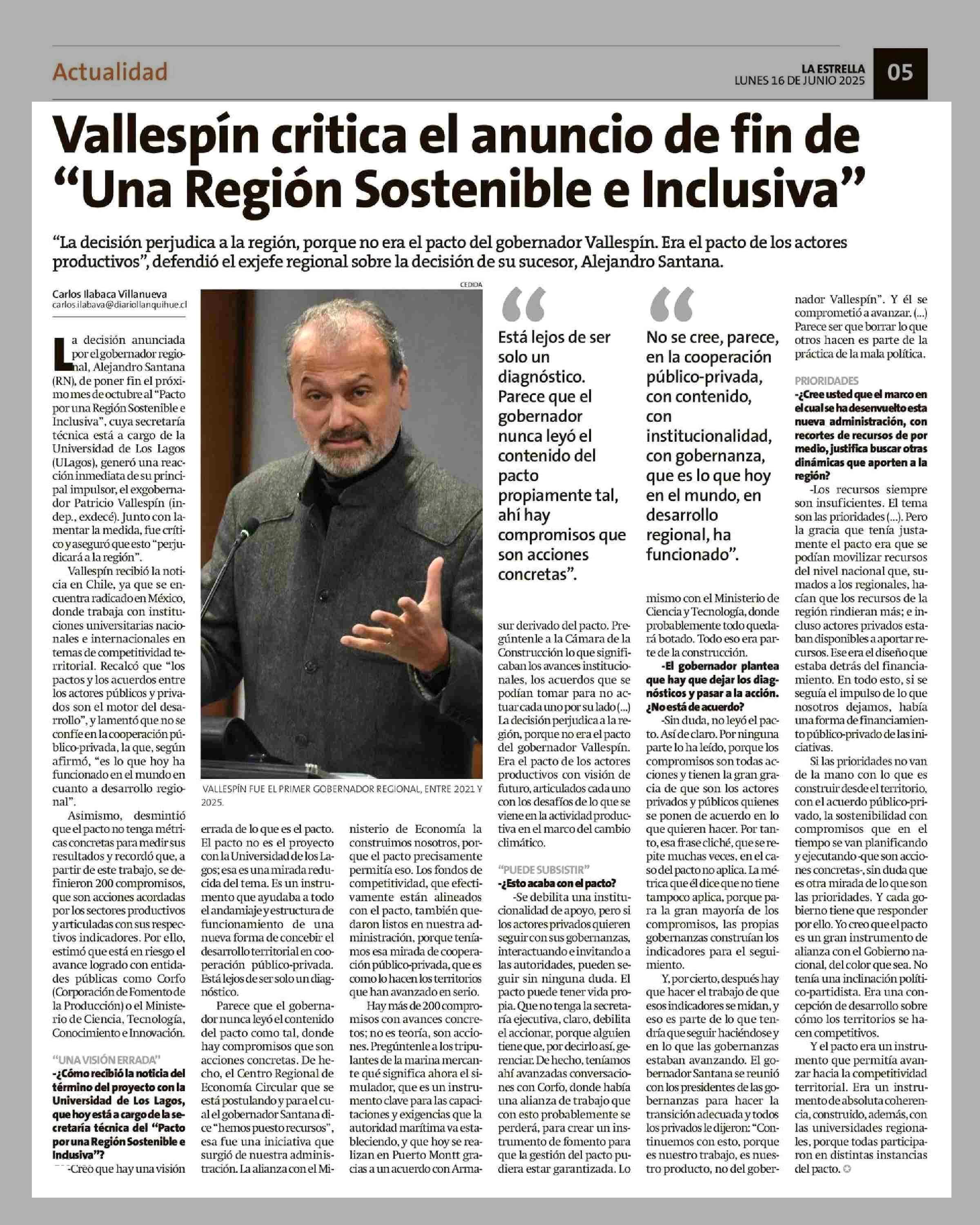 Vallespin critica el anuncio de fin de “Una Región Sostenible e Inclusiva” 16-06-2025 La Estrella de Chiloé |