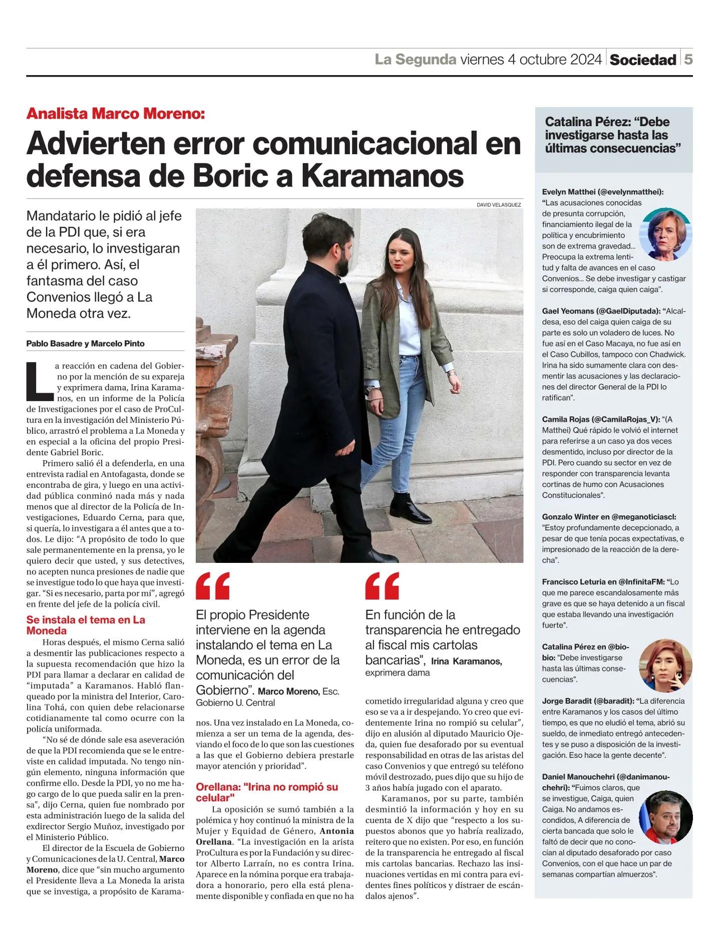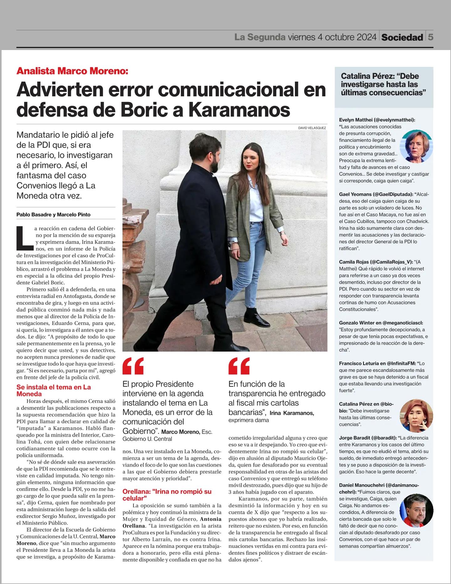 Advierten error comunicacional en defensa de Boric a Karamanos 04-10-2024 La Segunda |