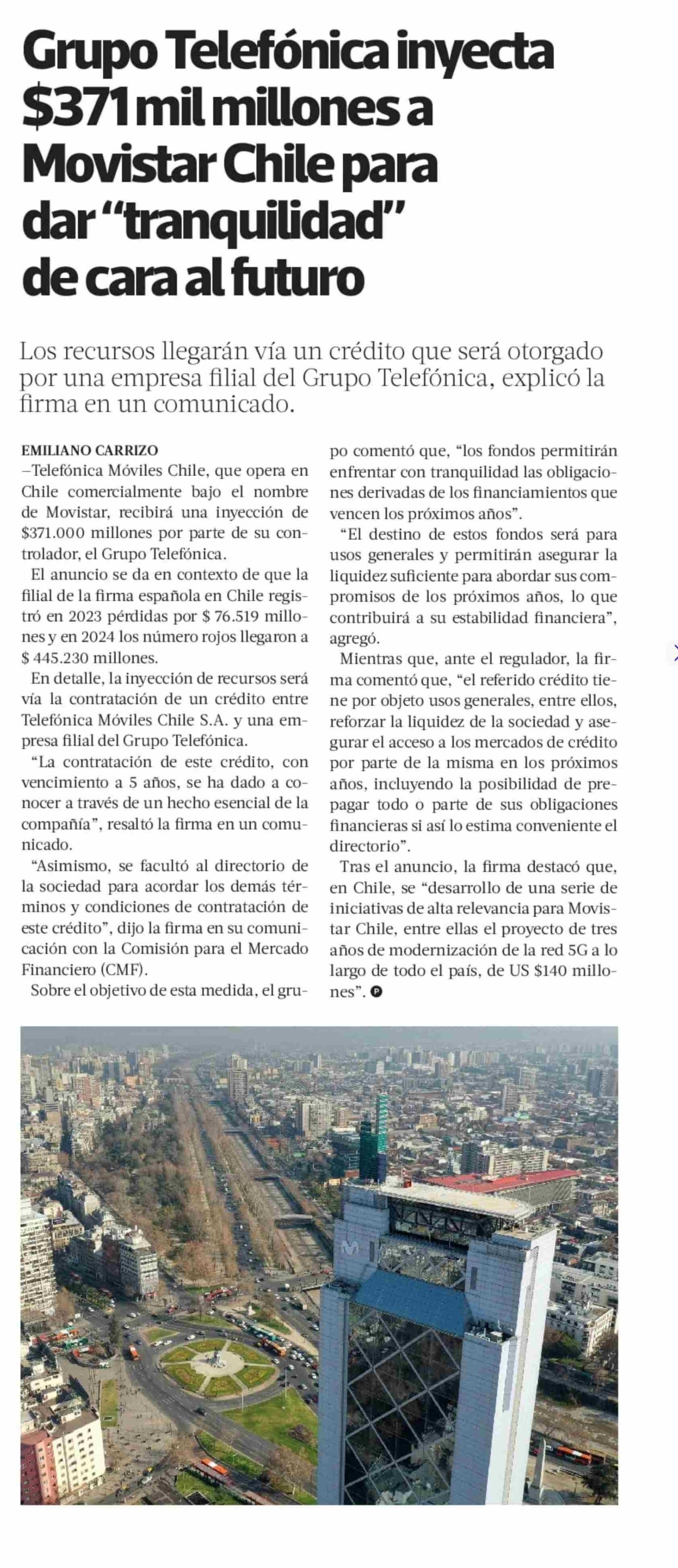 Grupo Telefónica inyecta $371 mil millones a Movistar Chile para dar“tranquilidad” de cara al futuro 21-05-2025 La Tercera |