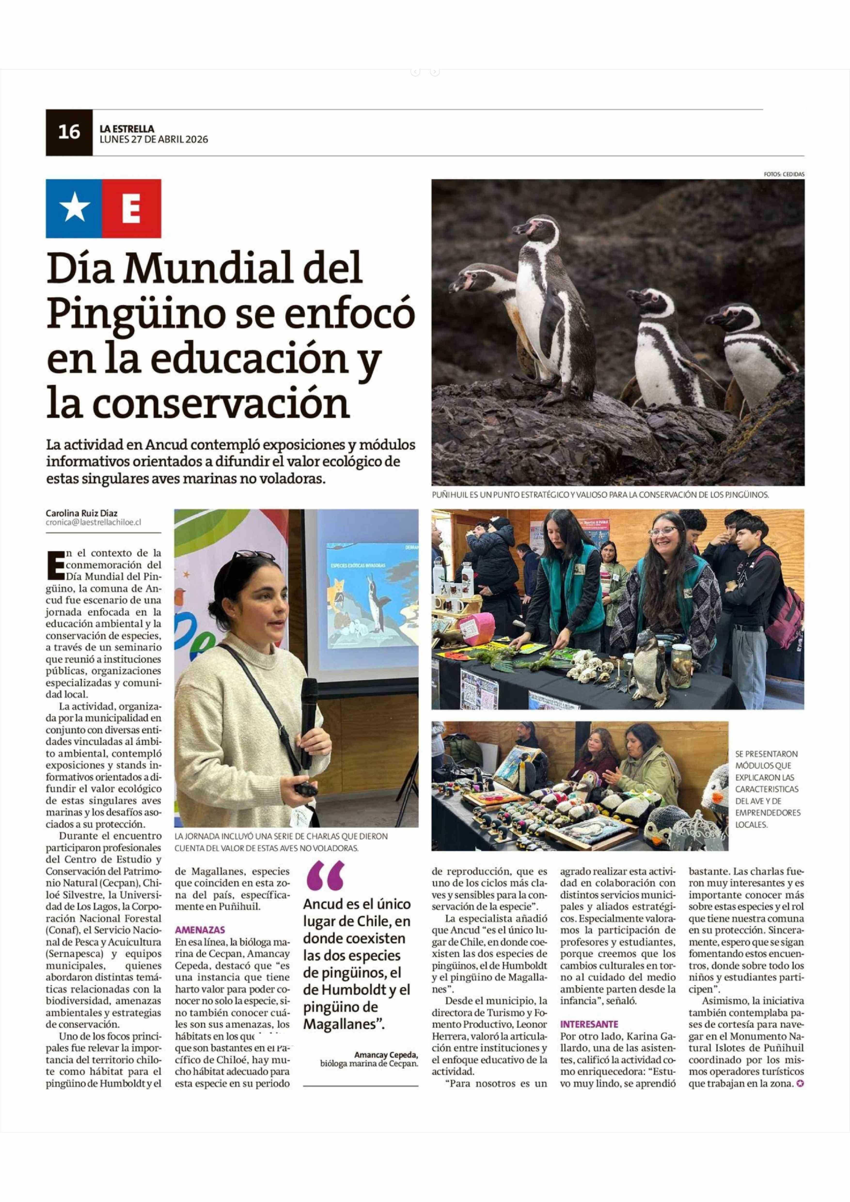 Día Mundial del Pingüino se enfocó en la educación y la conservación 27-04-2026 La Estrella de Chiloé |