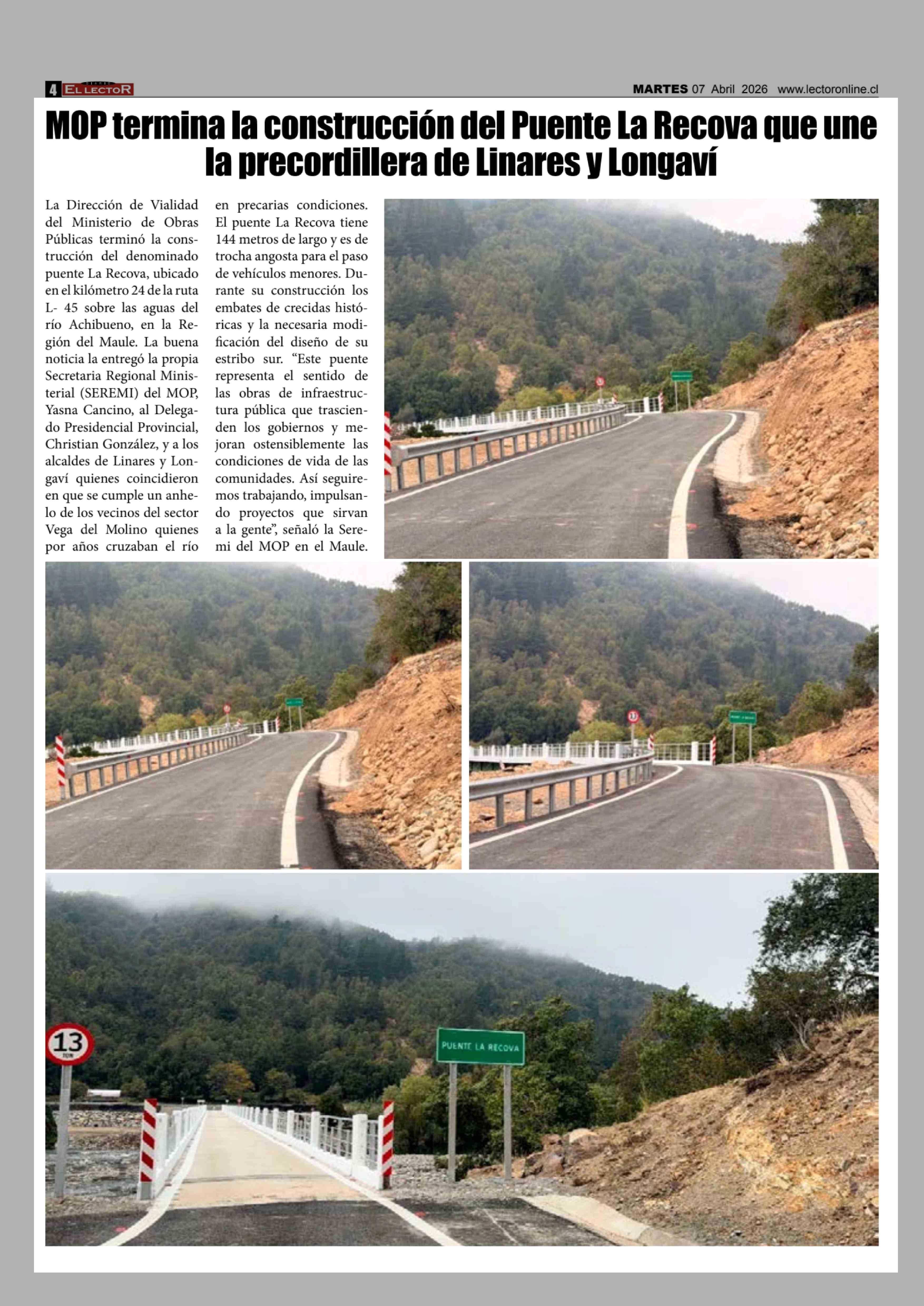 MOP termina la construcción del Puente La Recova que une la precordillera de Linares y Longaví 07-04-2026 El Lector |