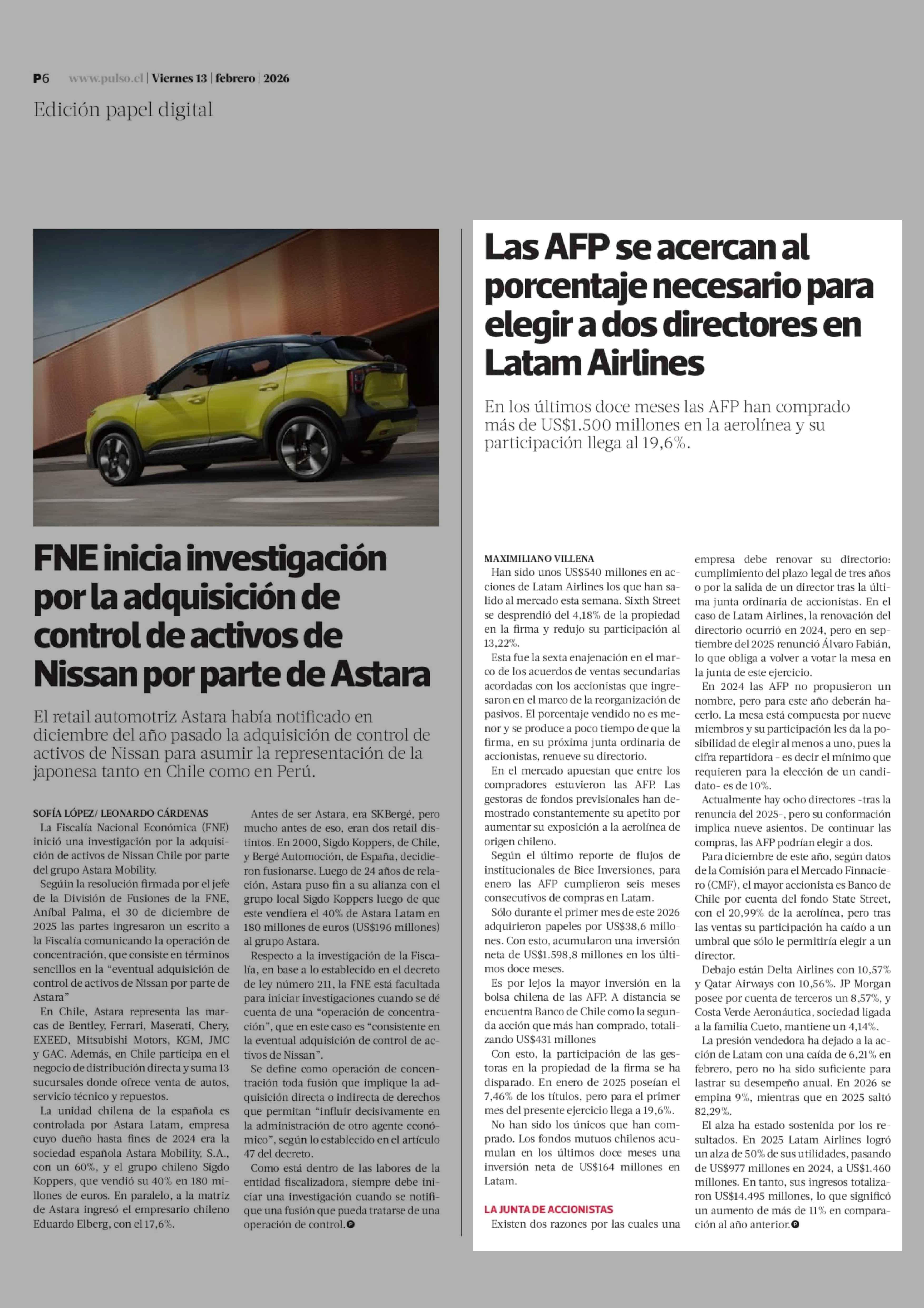 Las AFP se acercan al porcentaje necesario para elegir a dos directores en Latam Airlines 13-02-2026 La Tercera |