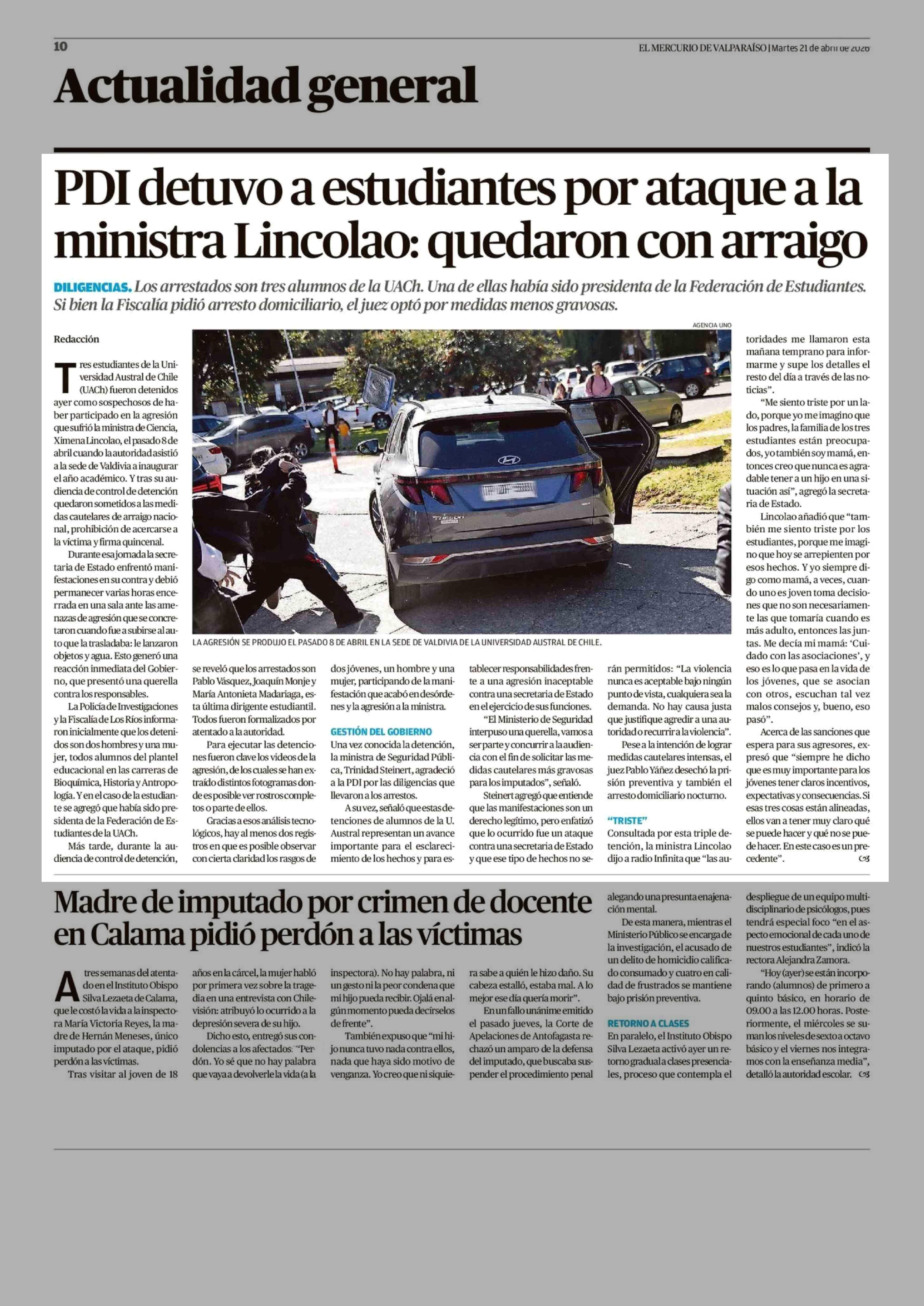 PDI detuvo a estudiantes por ataque a la ministra Lincolao: quedaron con arraigo 21-04-2026 El Mercurio de Valparaíso |