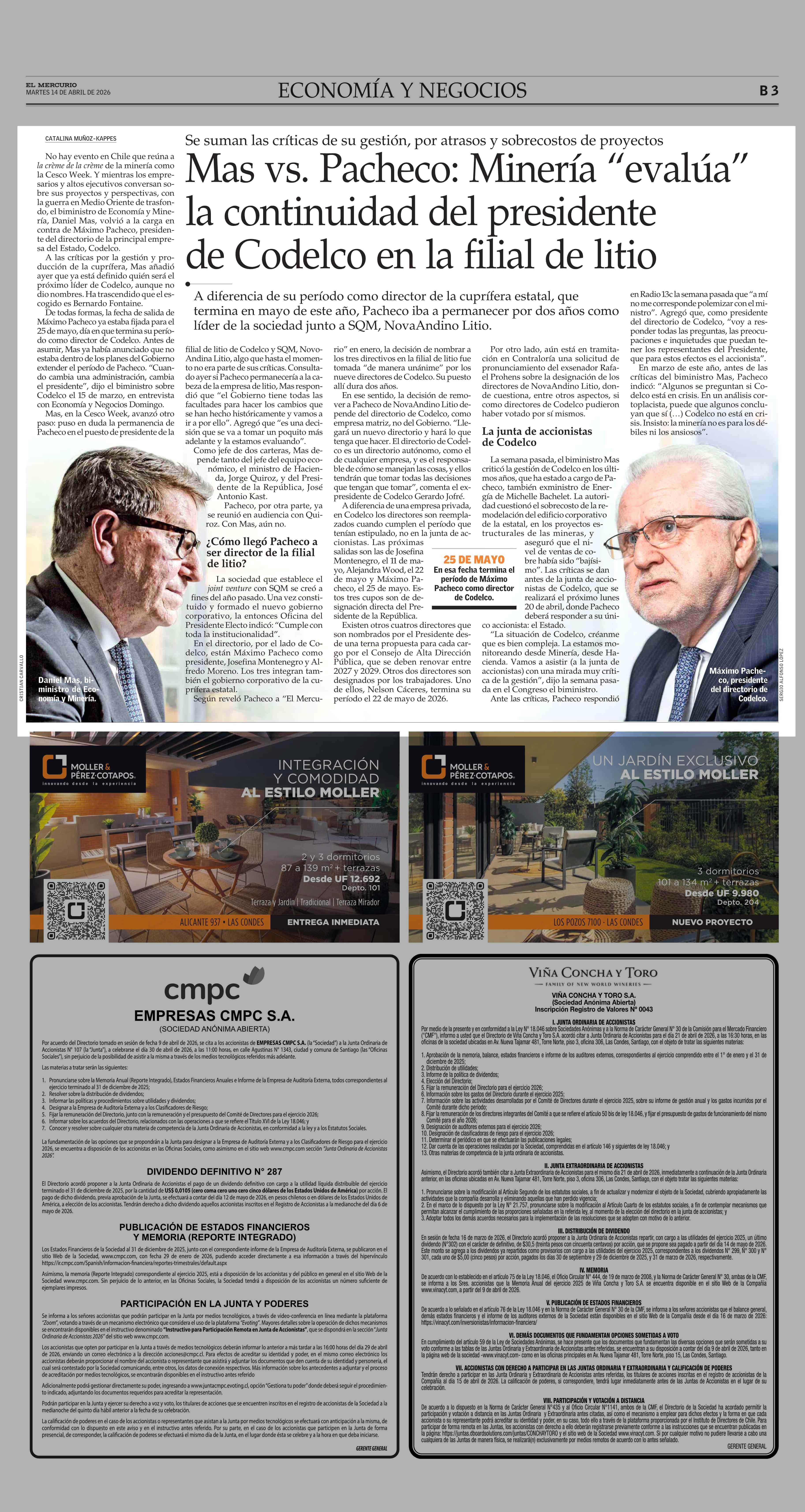 Mas vs. Pacheco: Minería “evalúa” la continuidad del presidente de Codelco en la filial de litio 14-04-2026 El Mercurio |