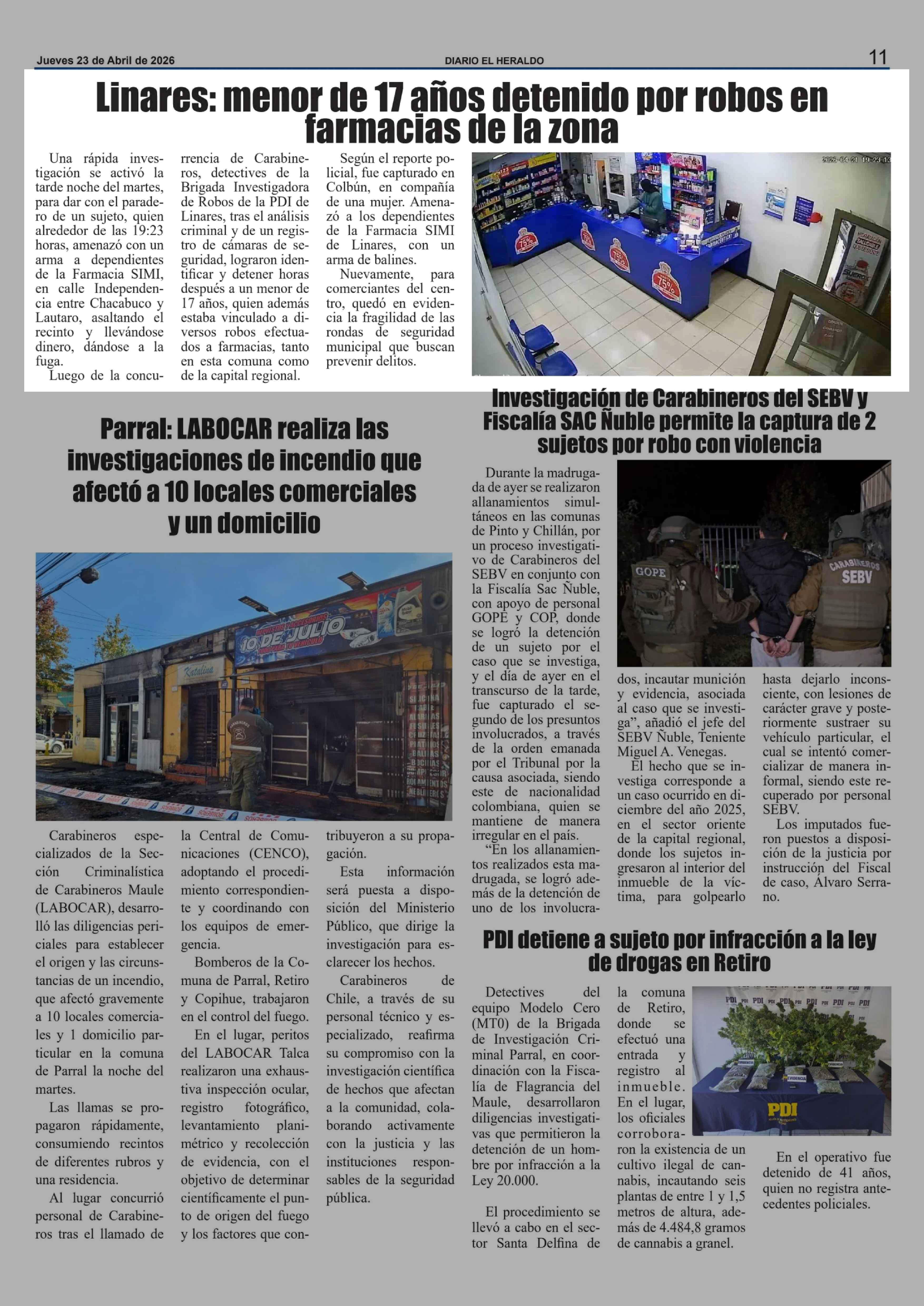 Título: Linares: menor de 17 años detenido por robos en farmacias de la zona