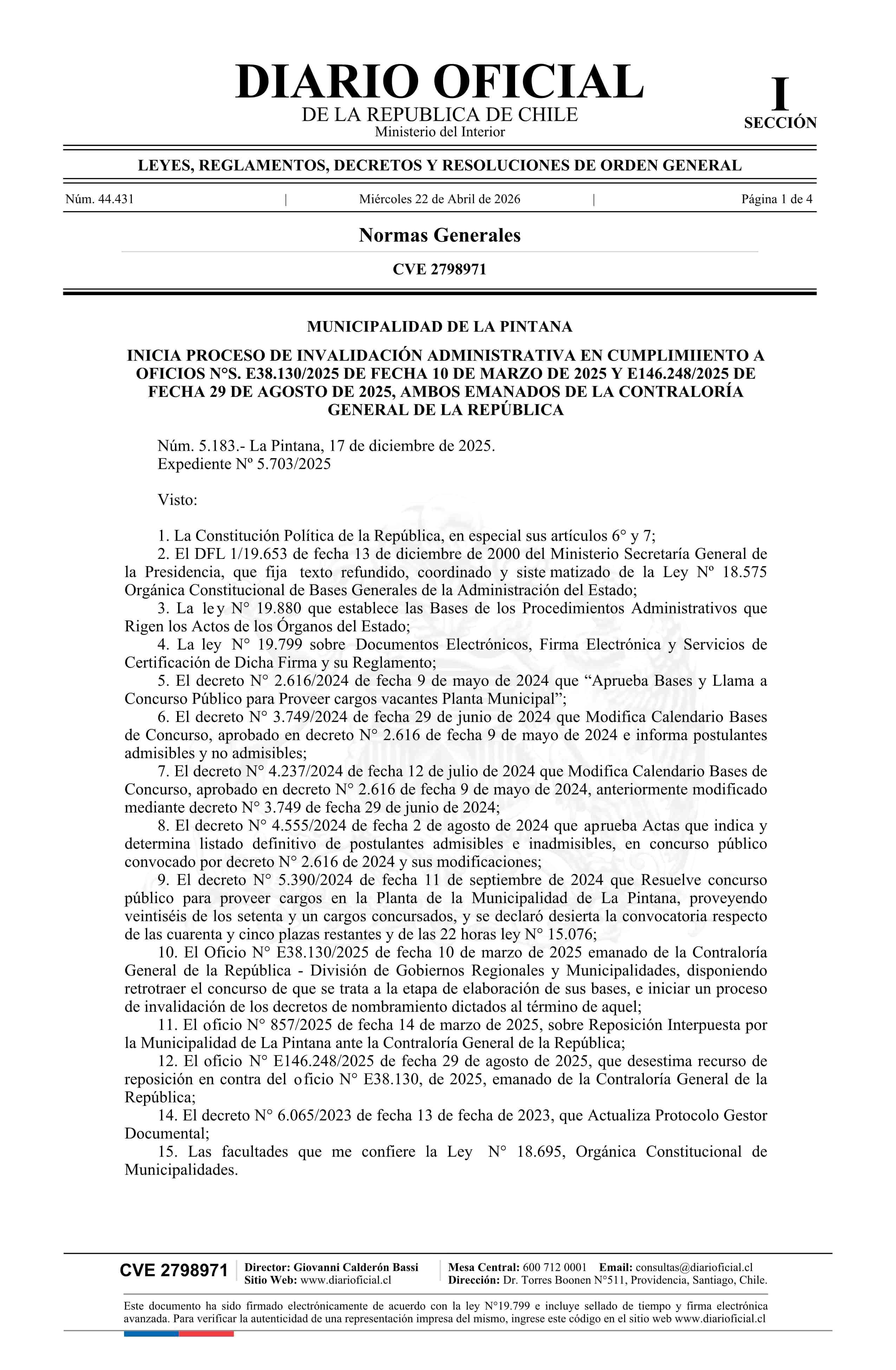 | Título: | Decreto alcaldicio número 5.183, de 2025.- Inicia proceso de invalidación administrativa en cumplimiento a oficios Nos. E38.130 y E146.248, de 2025, ambos emanados de la Contraloría General de la República |