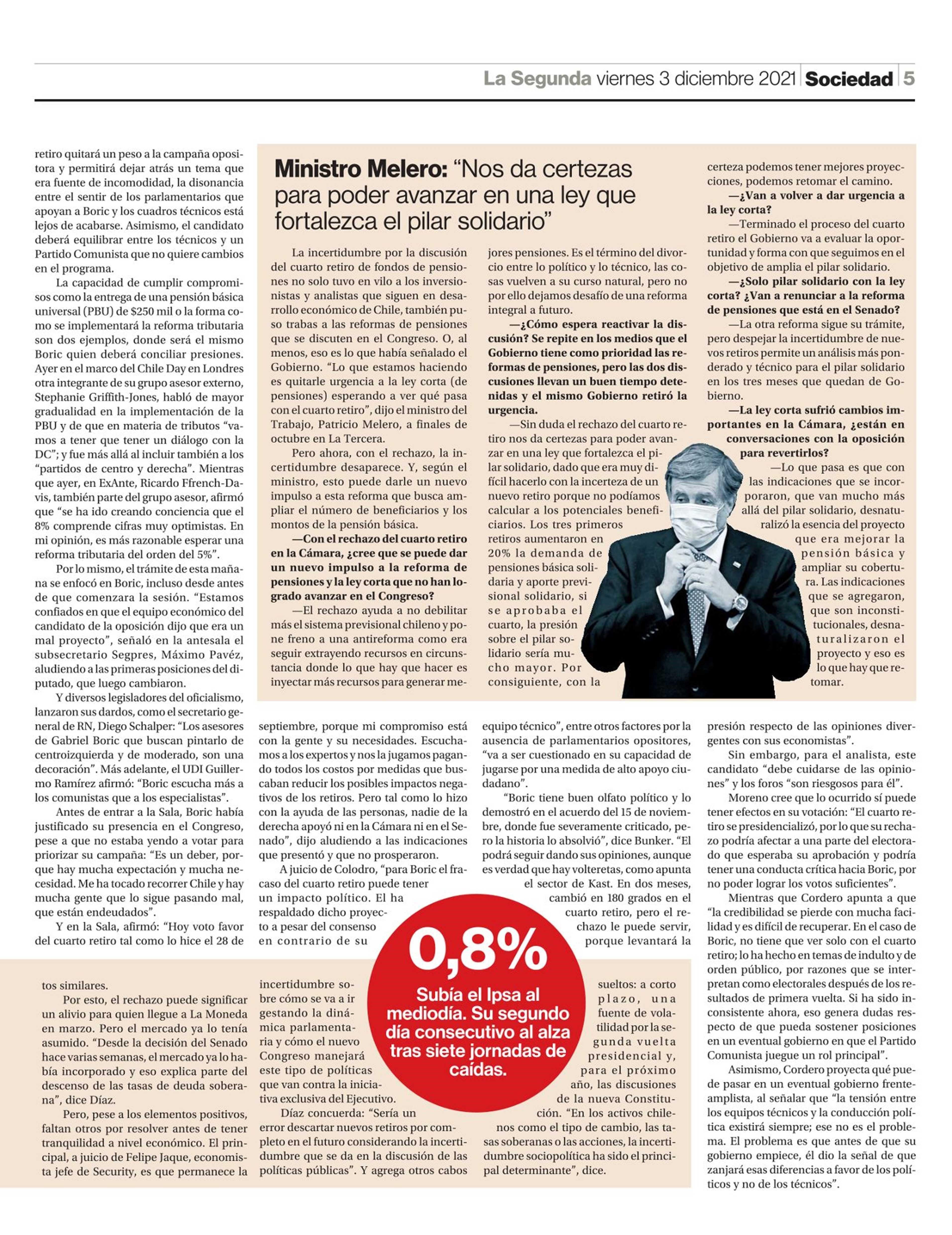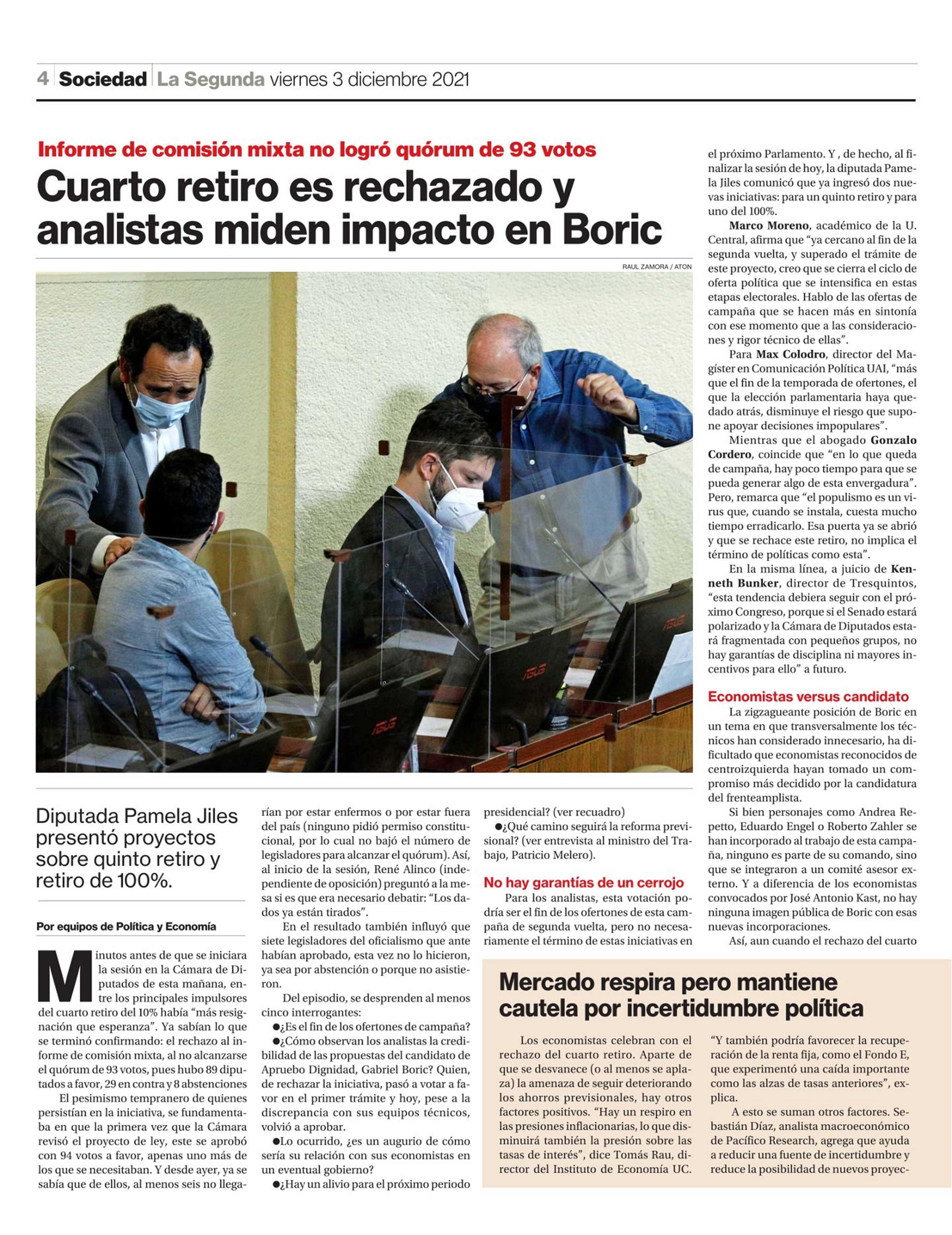 Cuarto retiro es rechazado y analistas miden impacto en Boric 03-12-2021 La Segunda |