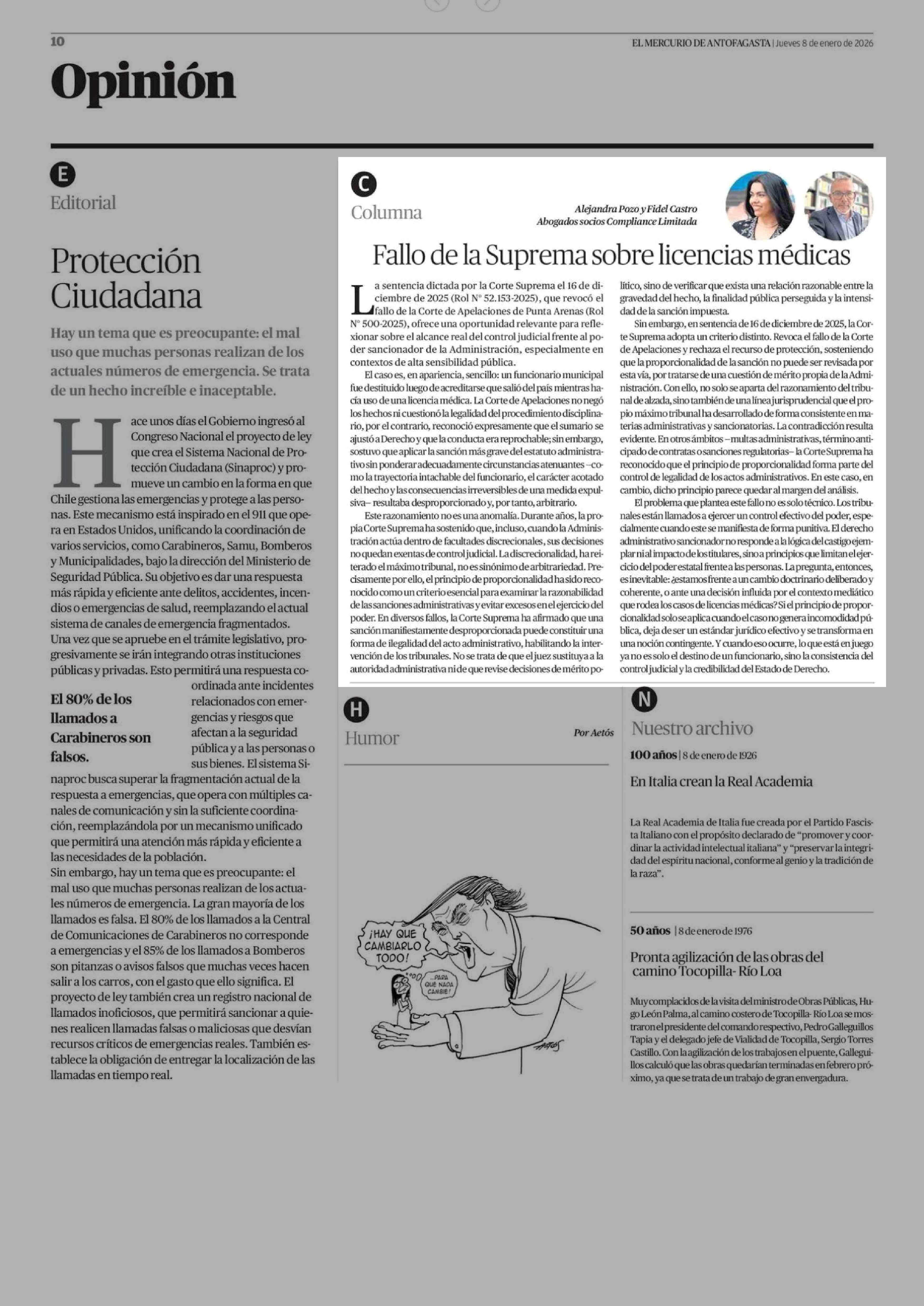 Columnas de Opinión: Fallo de la Suprema sobre licencias médicas 08-01-2026 El Mercurio de Antofagasta |