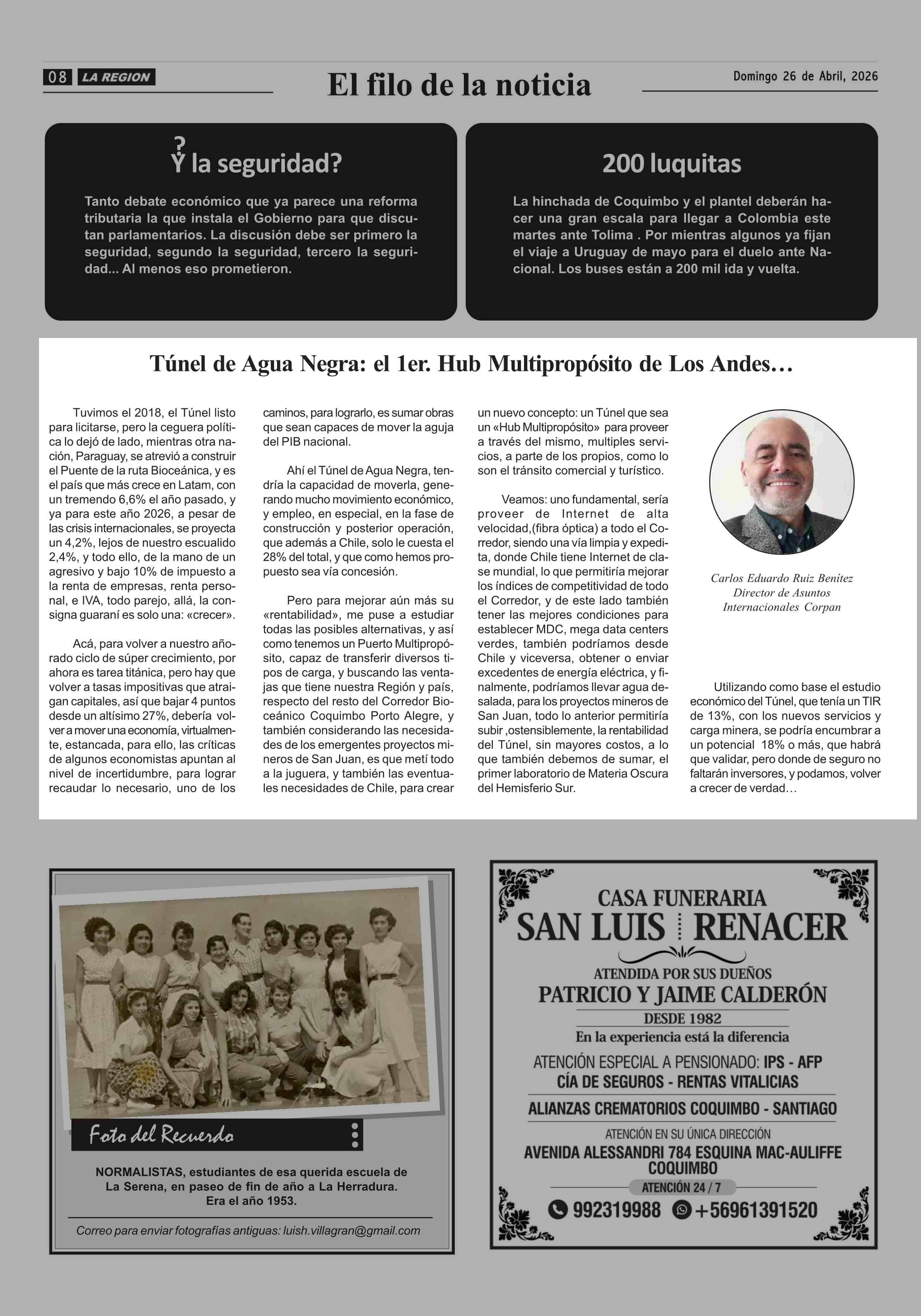 COLUMNAS DE OPINIÓN: Túnel de Agua Negra: el 1er. Hub Multipropósito de Los Andes... 26-04-2026 Diario la Región |