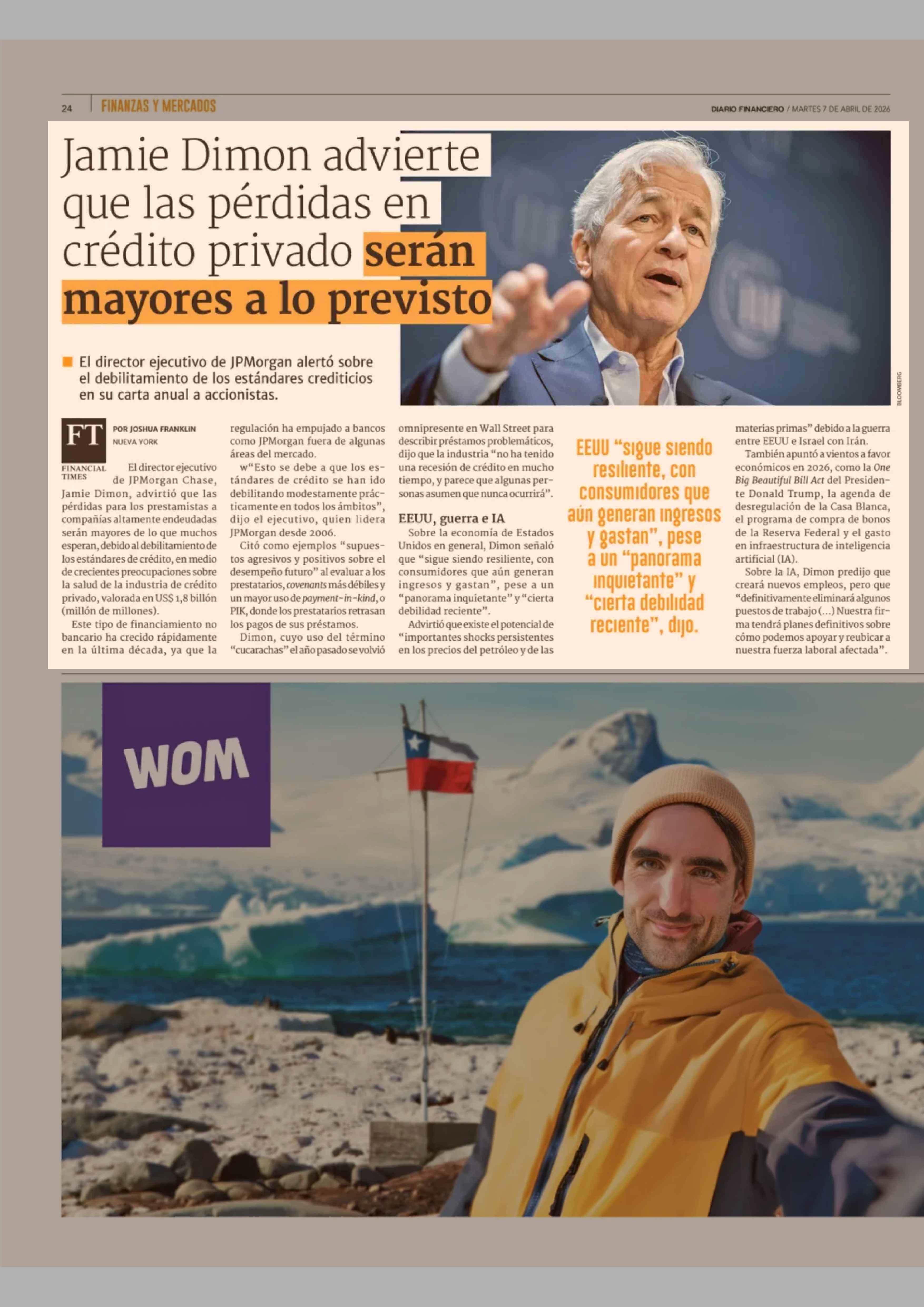 Jamie Dimon advierte que las pérdidas en crédito privado serán mayores a lo previsto 07-04-2026 Diario Financiero |