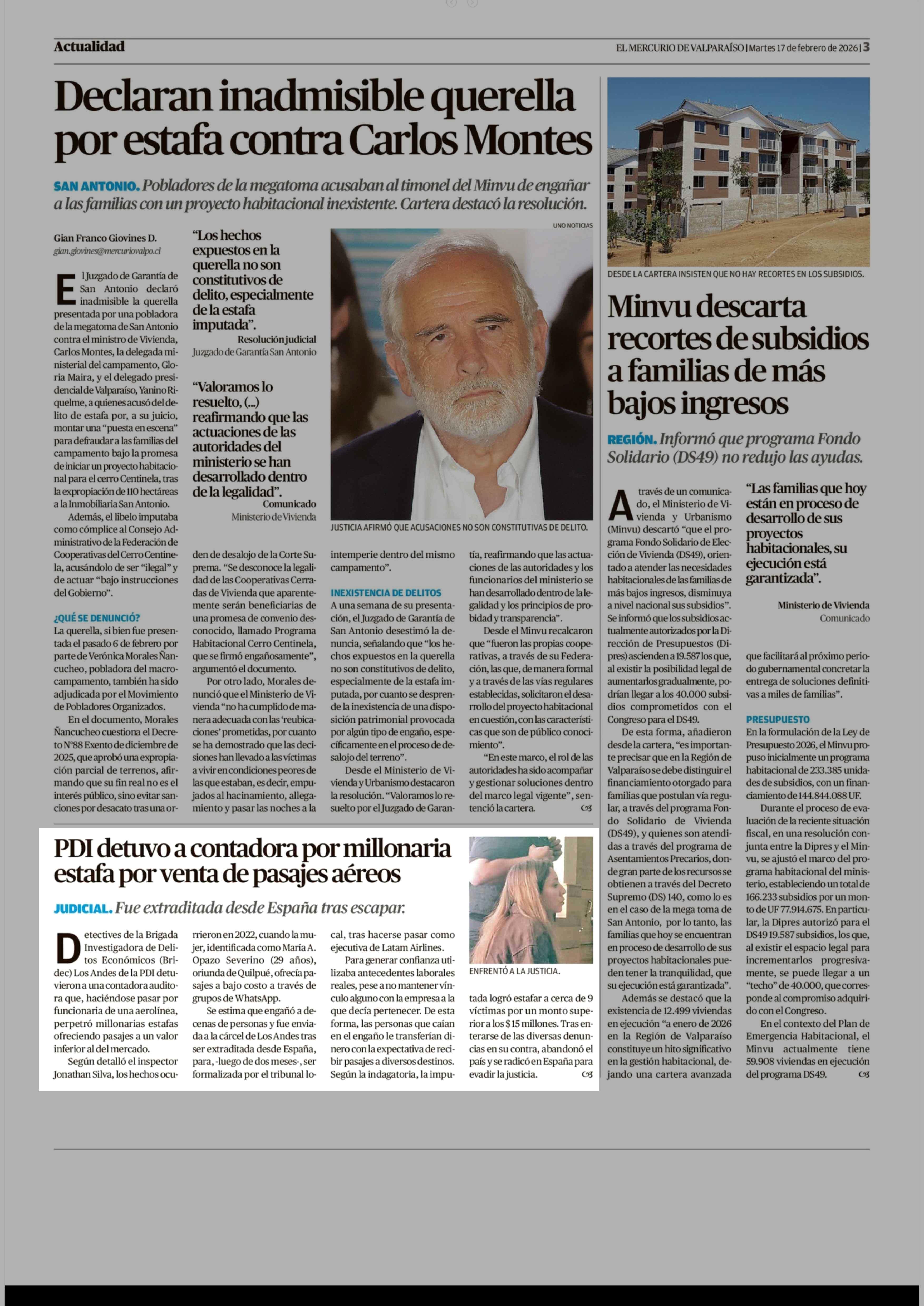 PDI detuvo a contadora por millonaria estafa por venta de pasajes aéreos 17-02-2026 El Mercurio de Valparaíso |