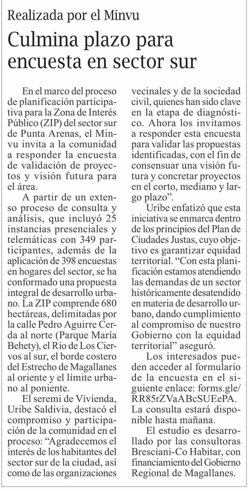 | Título: | Culmina plazo para encuesta en sector sur |