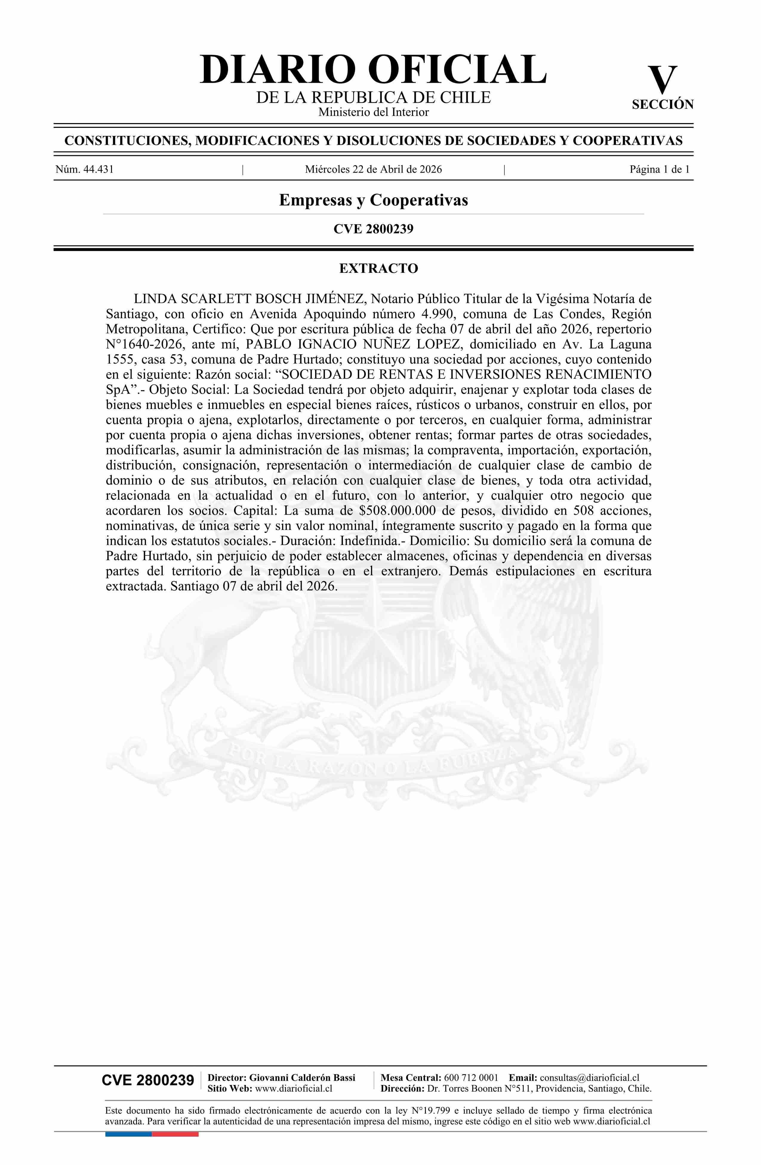SOCIEDAD DE RENTAS E INVERSIONES RENACIMIENTO SpA 22-04-2026 Diario Oficial Edición Electrónica |
