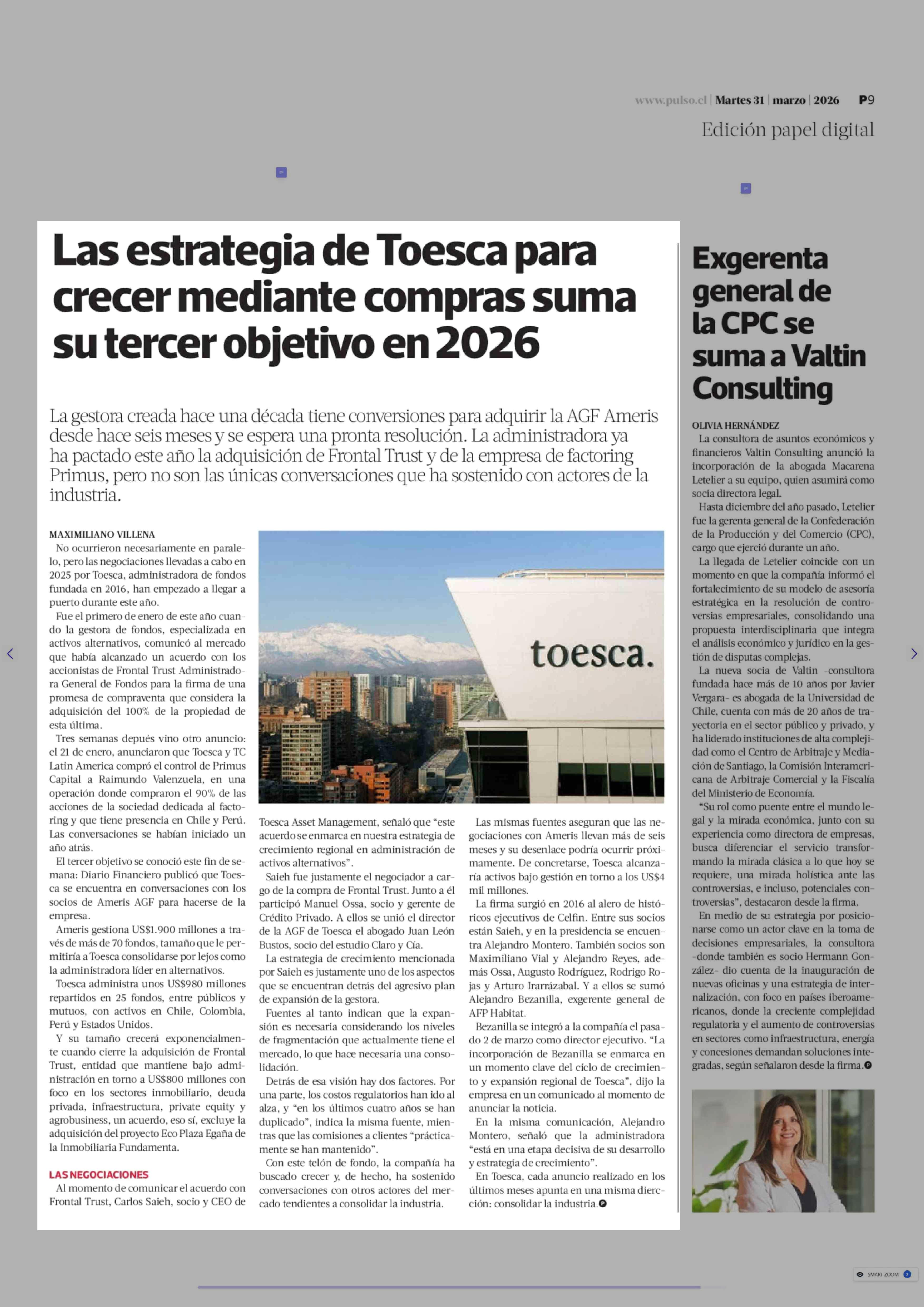 Título: Las estrategia de Toesca para crecer mediante compras suma su tercer objetivo en 2026