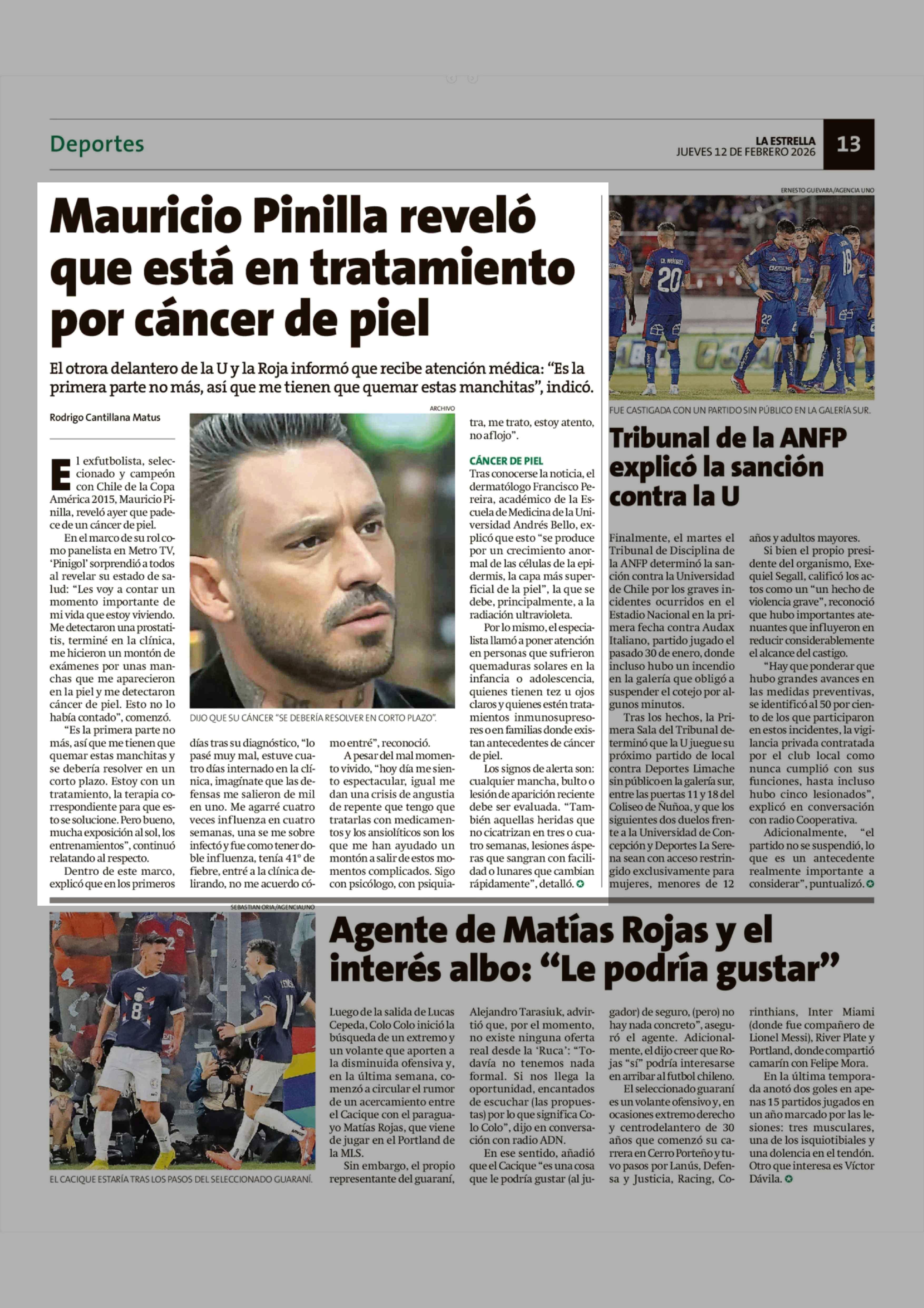 Mauricio Pinilla reveló que está en tratamiento por cáncer de piel 12-02-2026 La Estrella de Valparaíso |