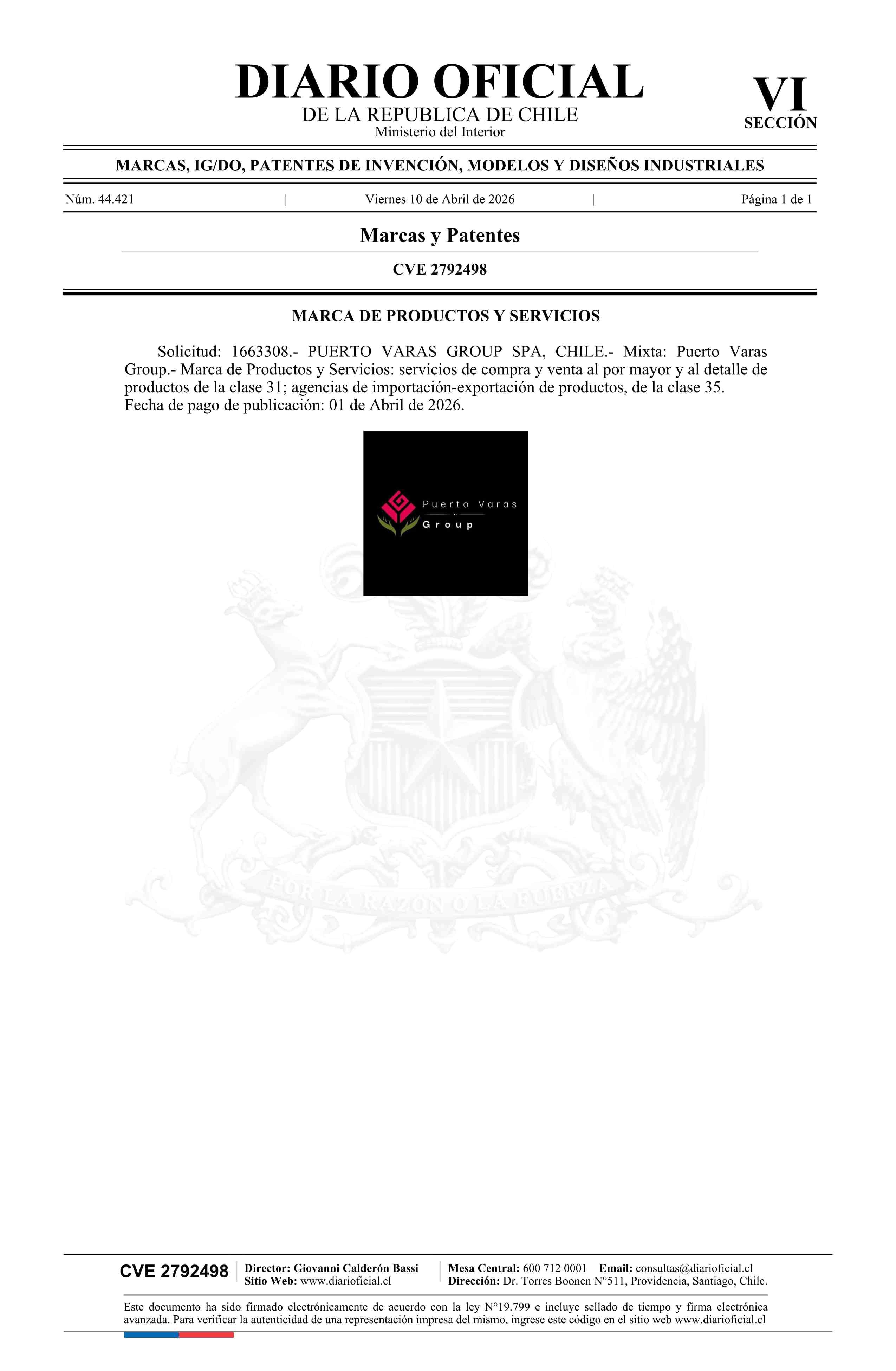 Solicitud número 1663308.- Puerto Varas Group 10-04-2026 Diario Oficial Edición Electrónica |