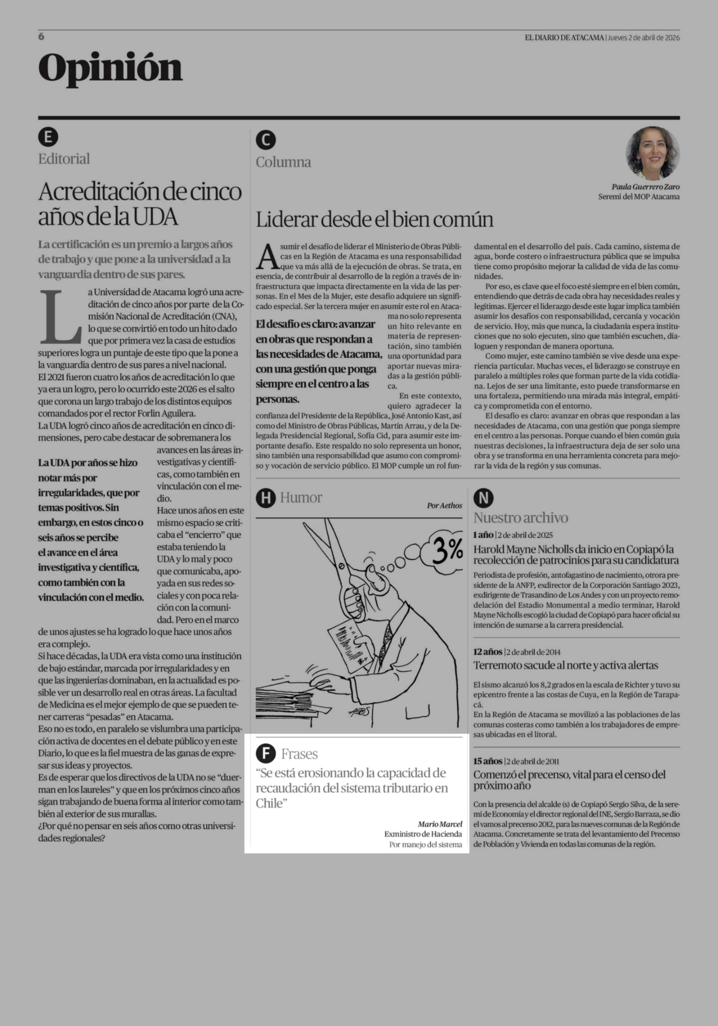 Frases "Se está erosionando la capacidad de recaudación del sistema tributario en Chile" 02-04-2026 El Diario de Atacama |