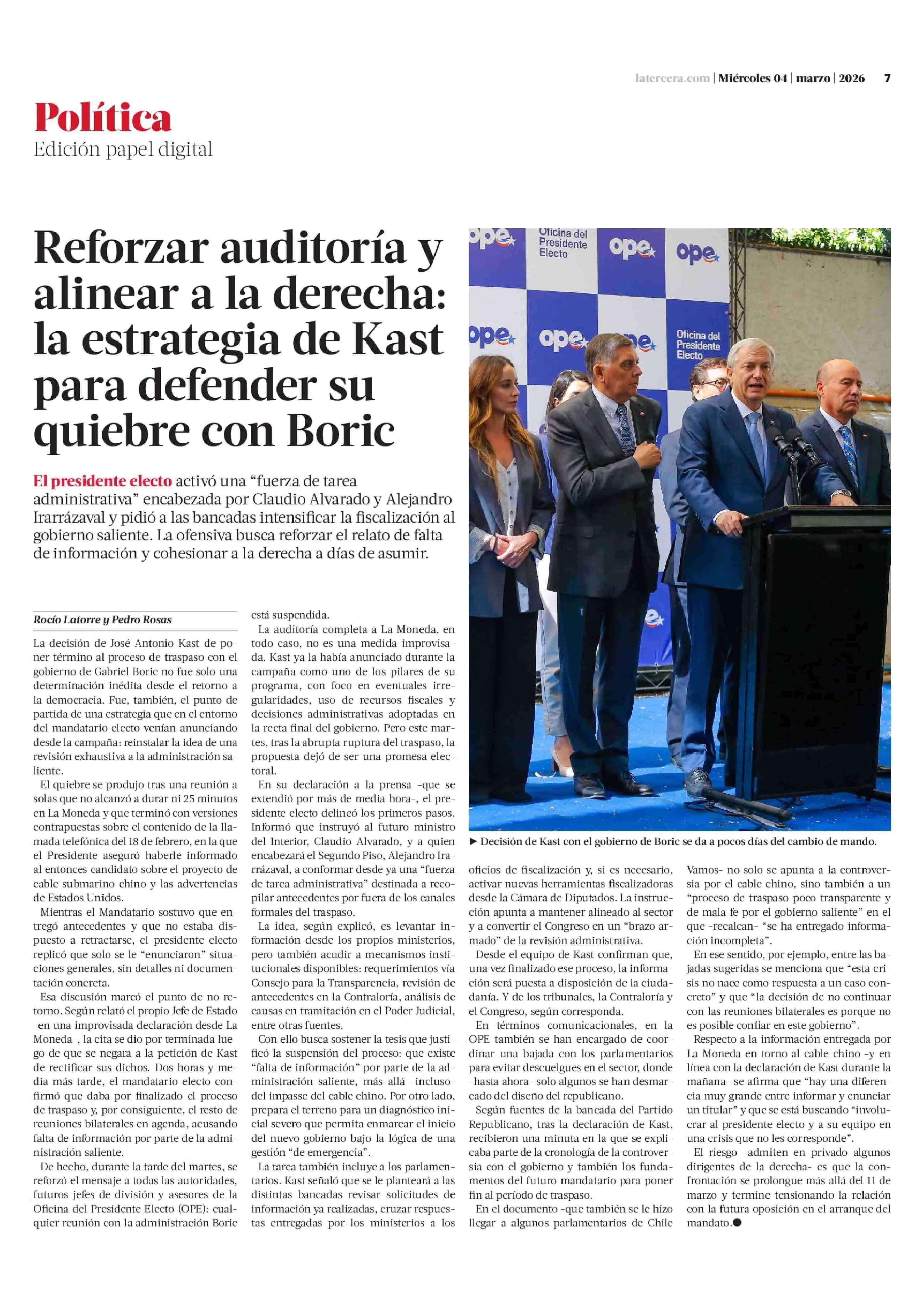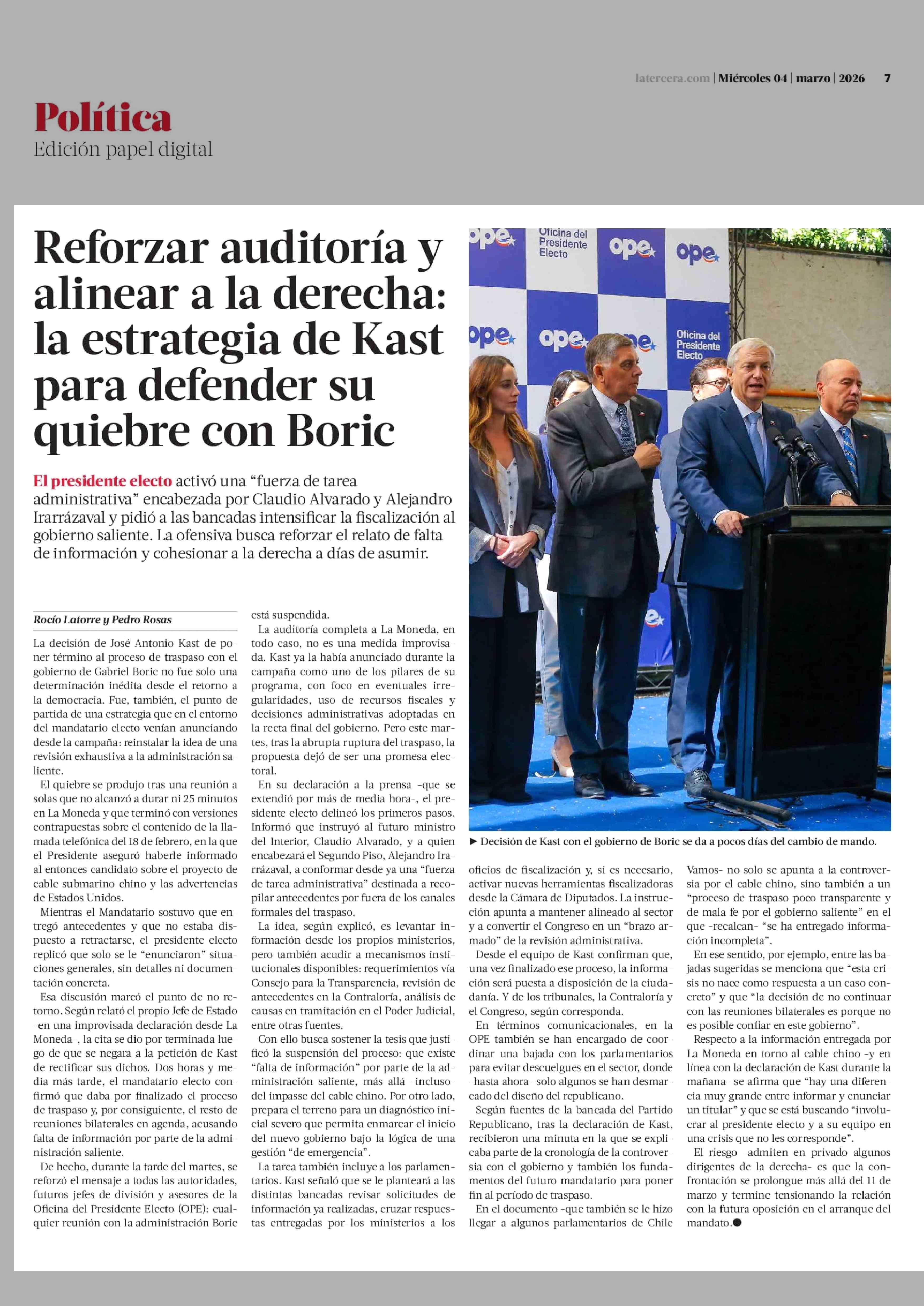 Reforzar auditoría y alinear a la derecha: la estrategia de Kast para defender su quiebre con Boric 04-03-2026 La Tercera |