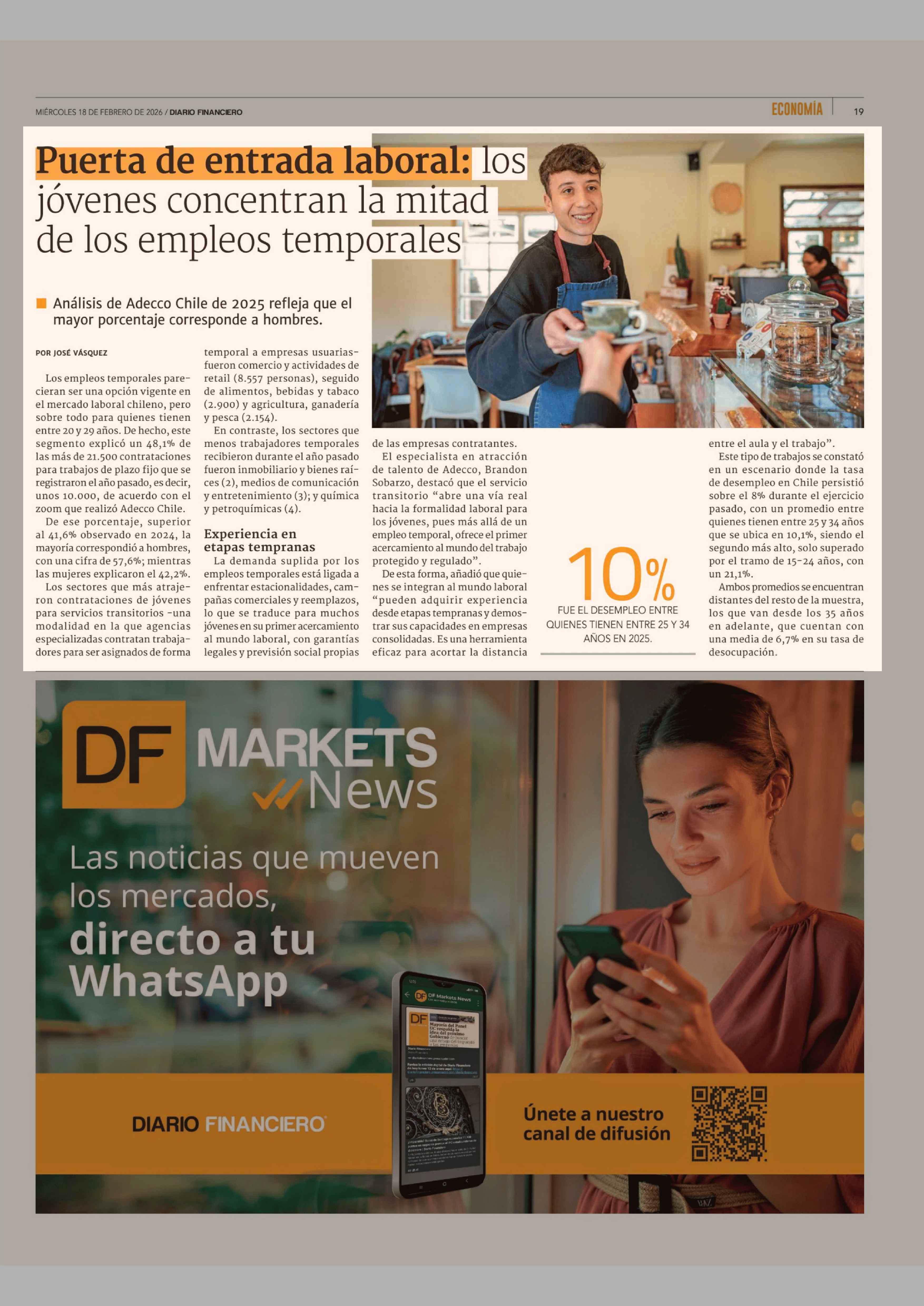 Puerta de entrada laboral: los jóvenes concentran la mitad de los empleos temporales 18-02-2026 Diario Financiero |