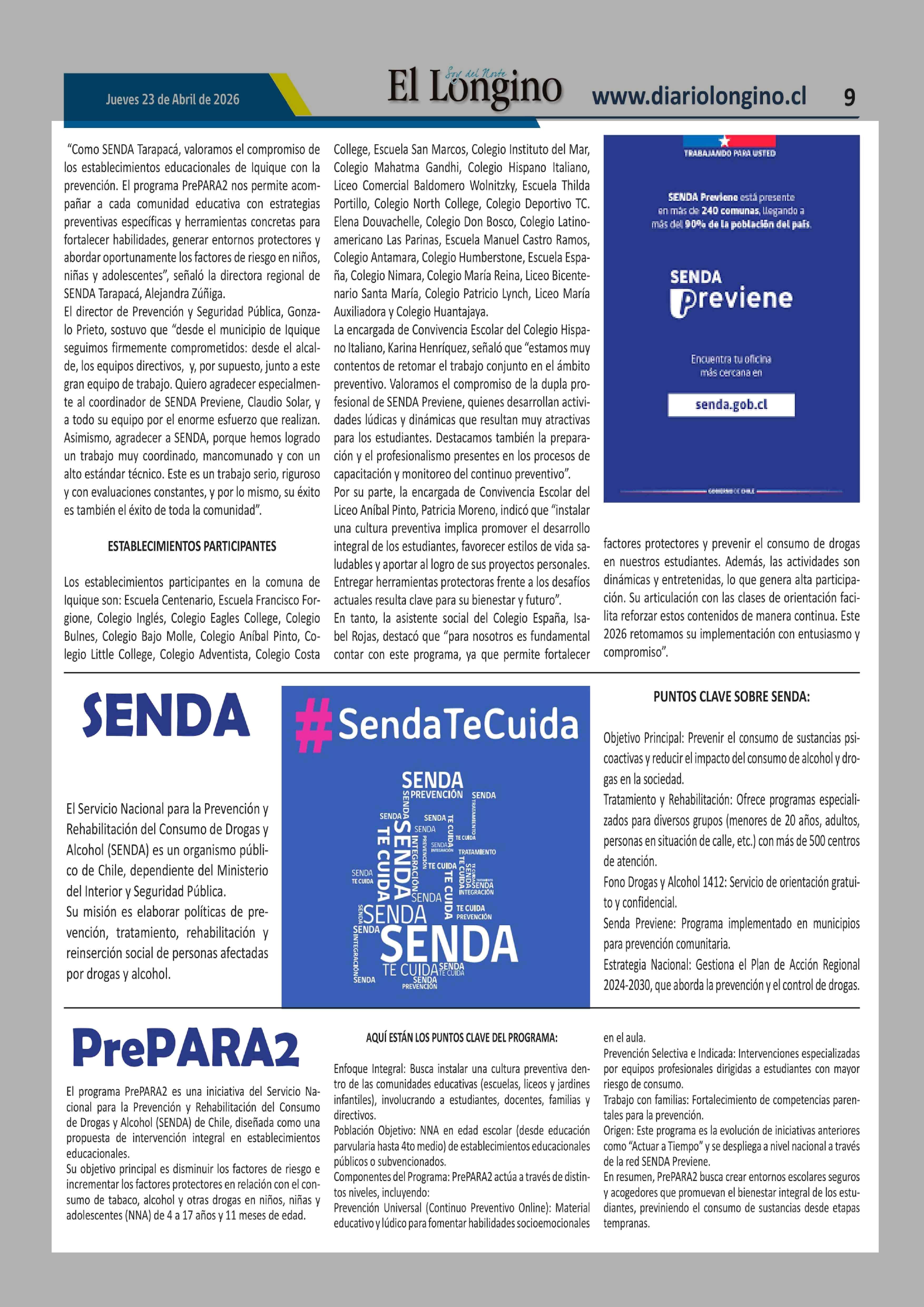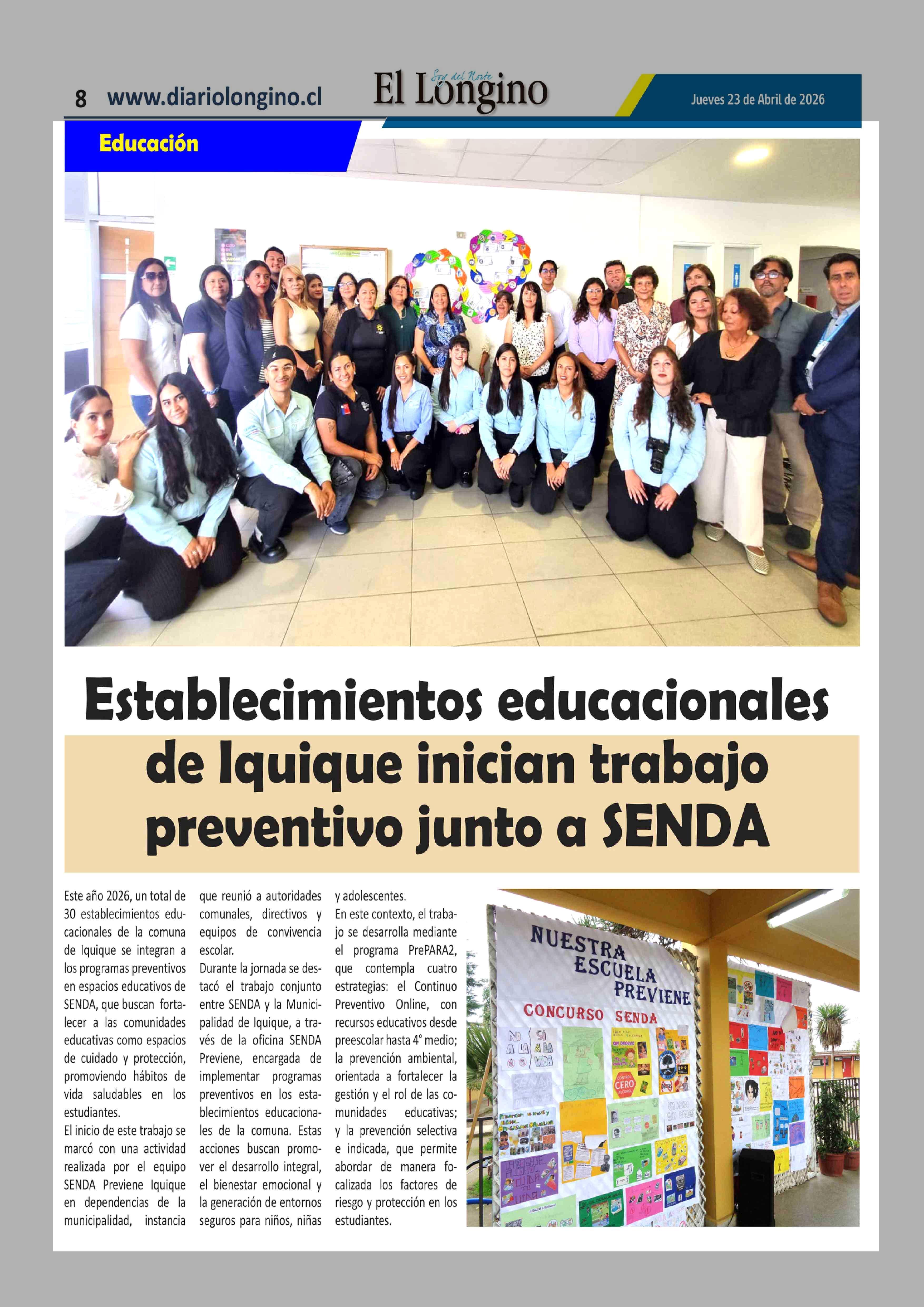 Establecimientos educacionales de Iquique inician trabajo preventivo junto a SENDA 23-04-2026 El Longino |