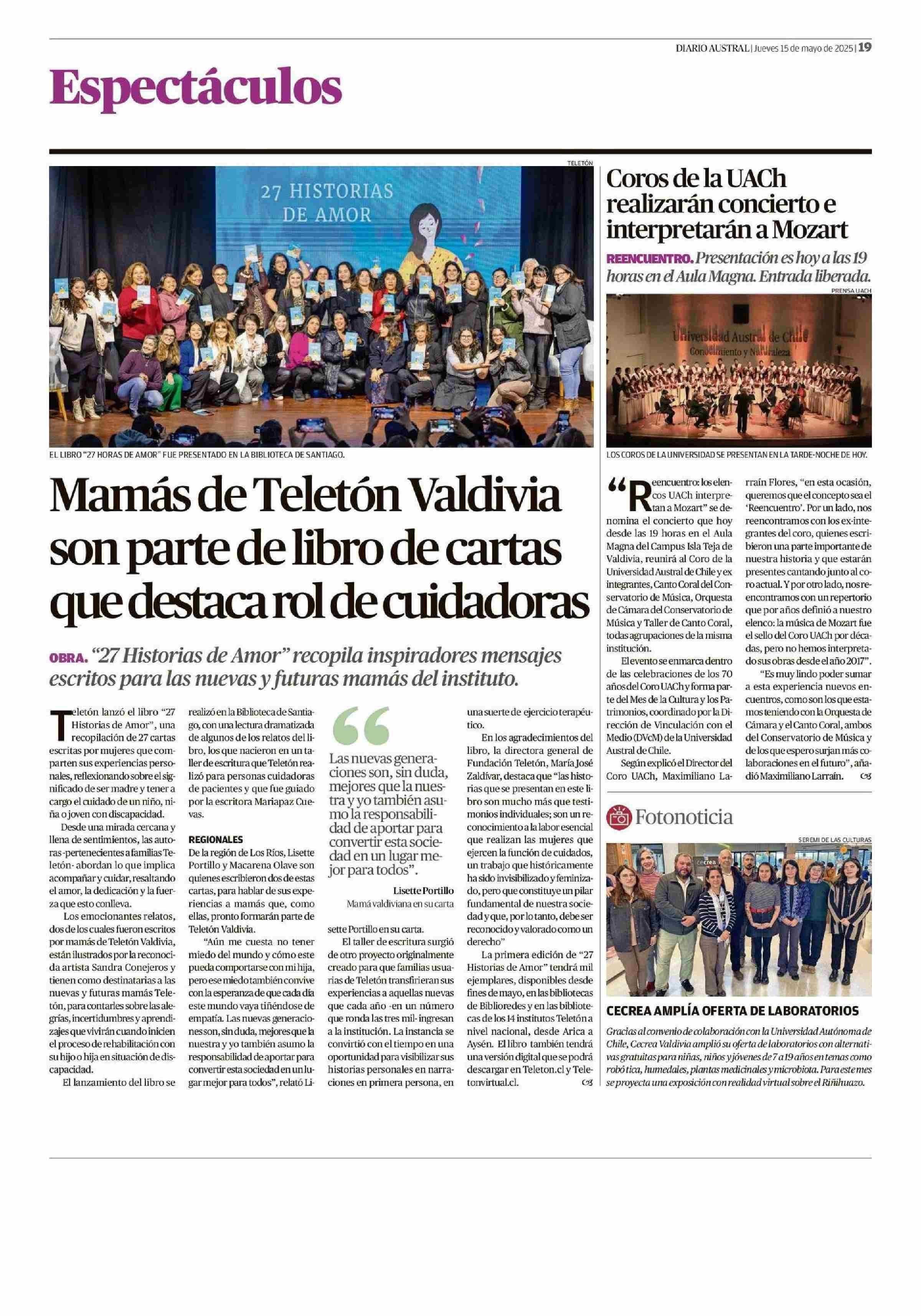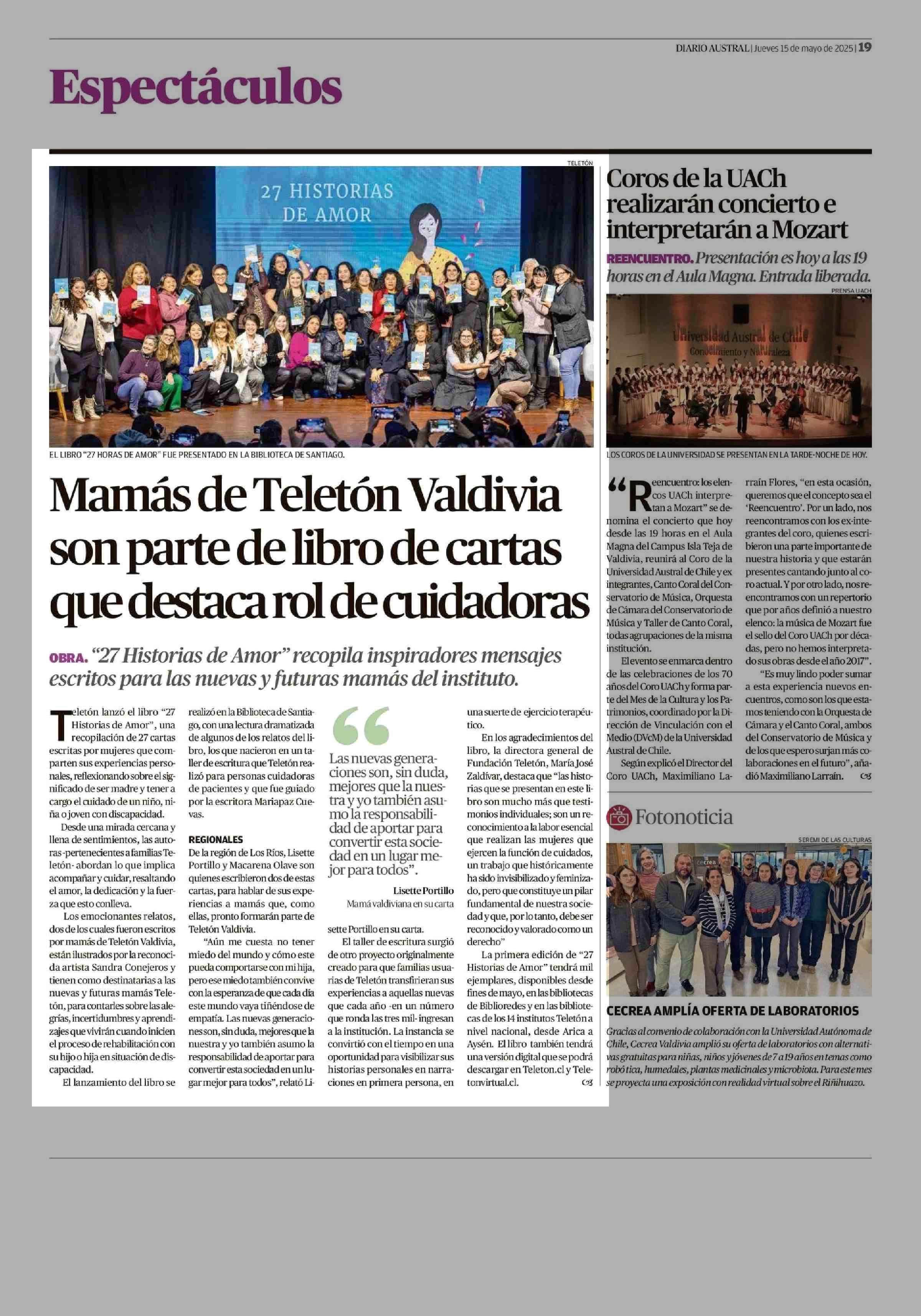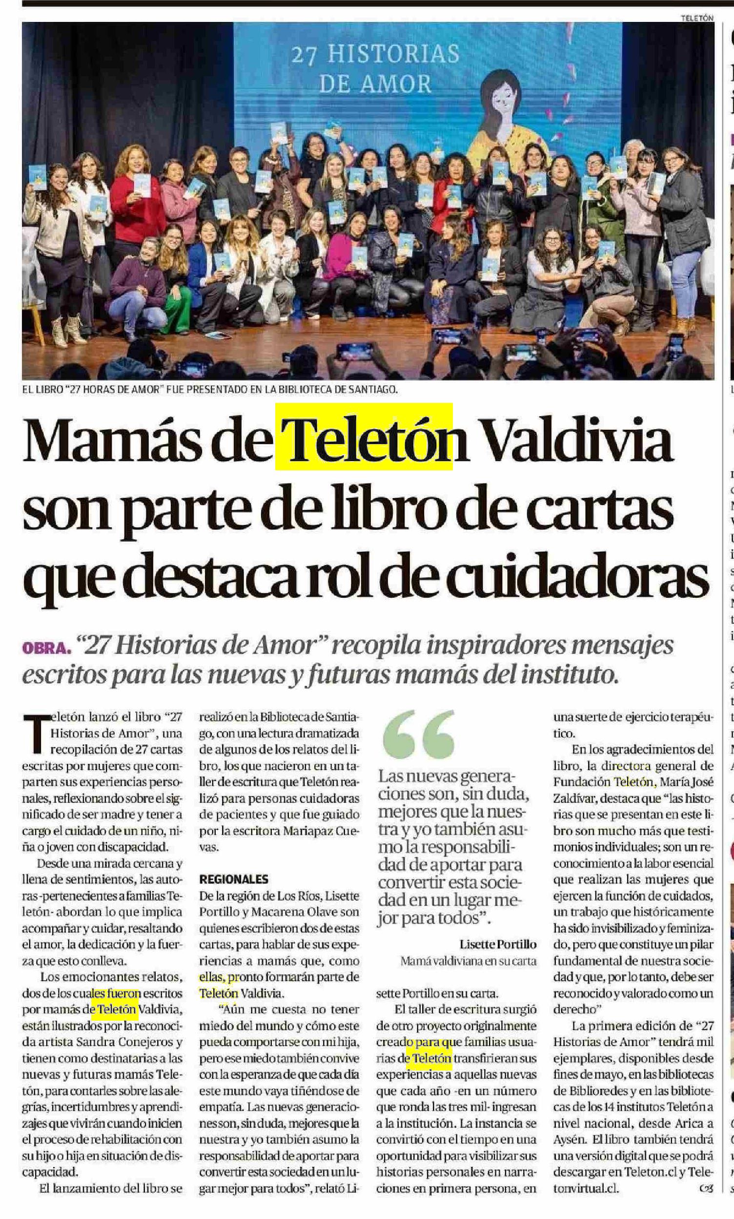 Mamás de Teletón Valdivia son parte de libro de cartas que destaca rol de cuidadoras 15-05-2025 Diario Austral Región de Los Ríos |