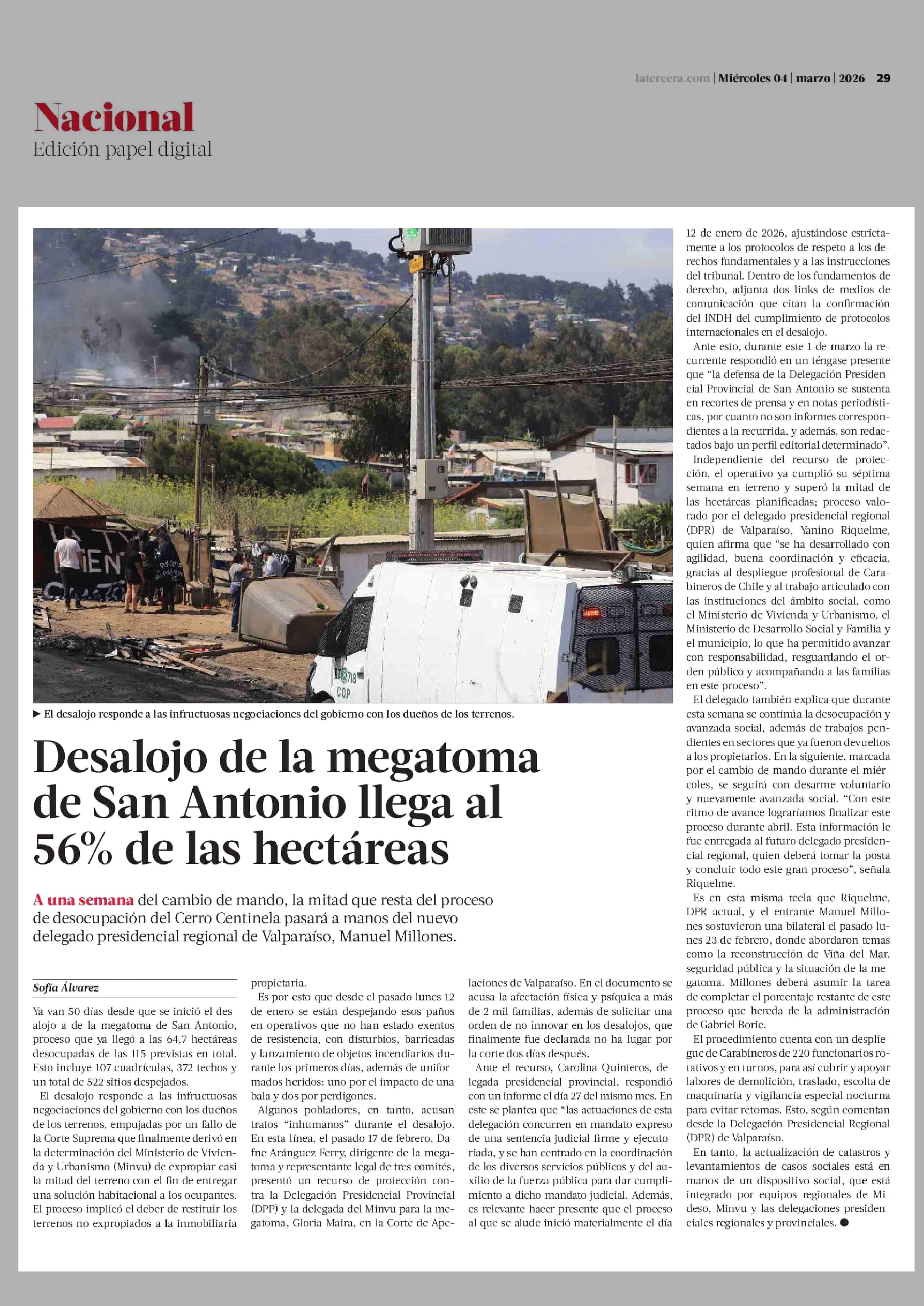 Título: Desalojo de la megatoma de San Antonio llega al 56% de las hectáreas