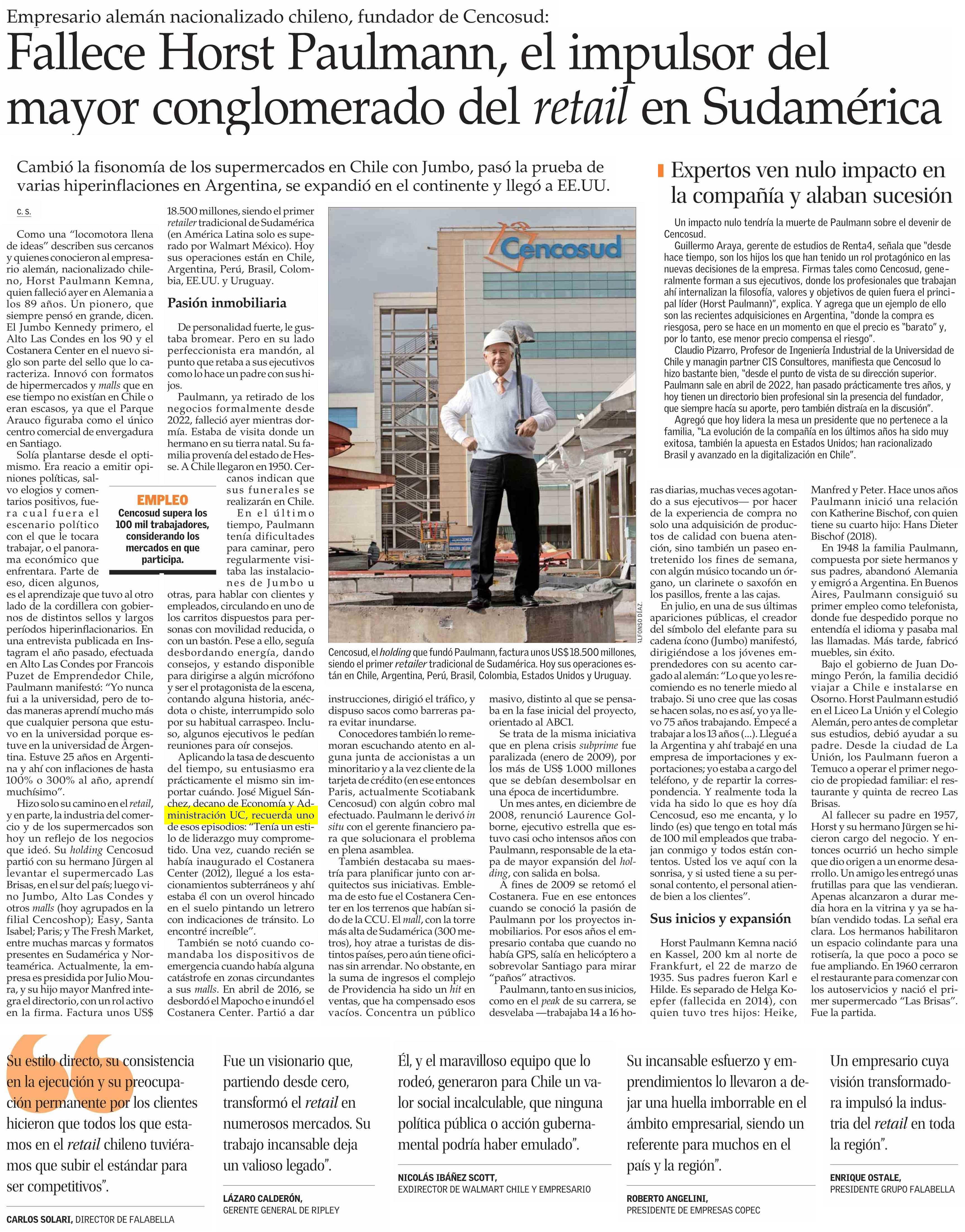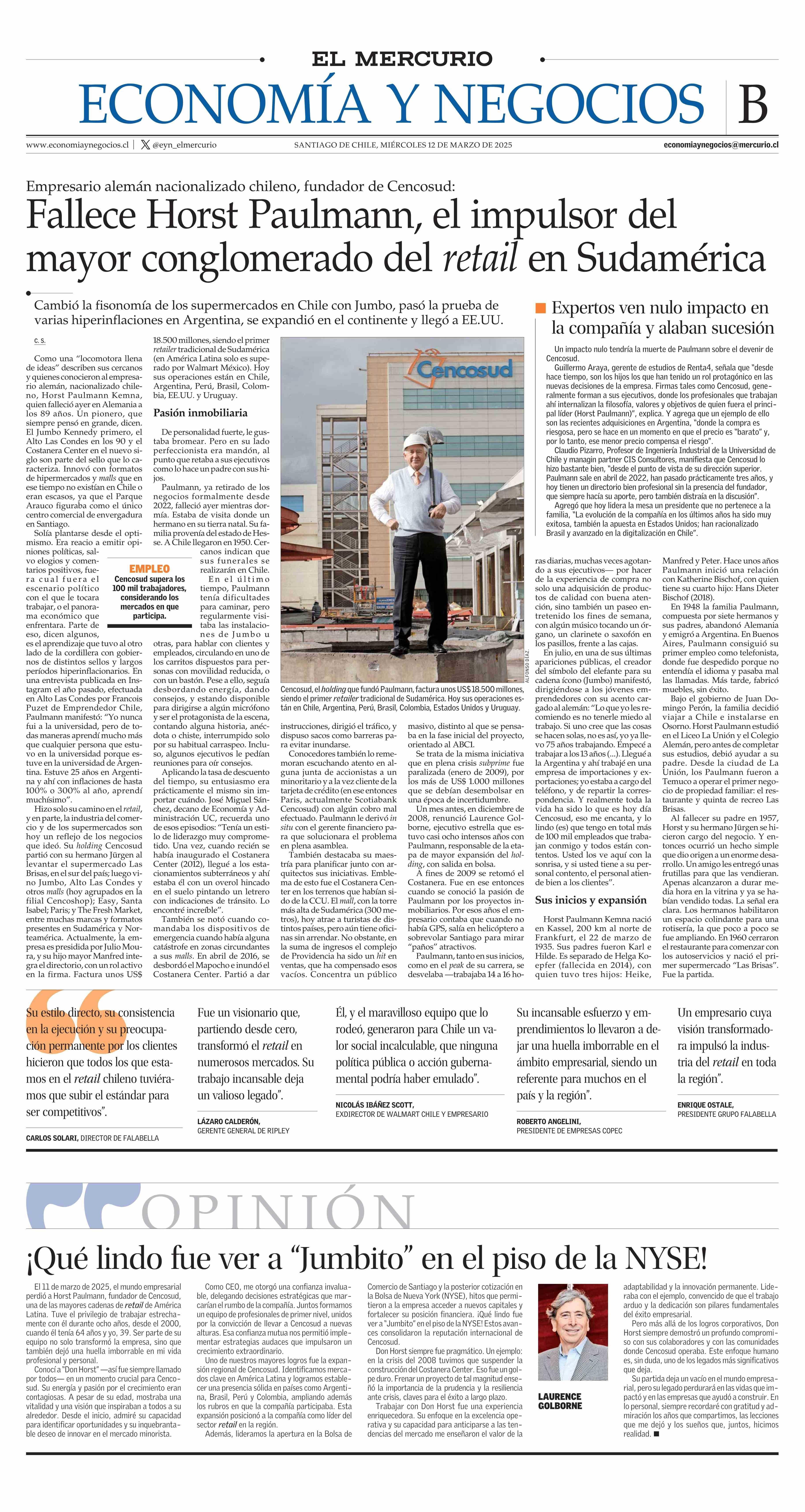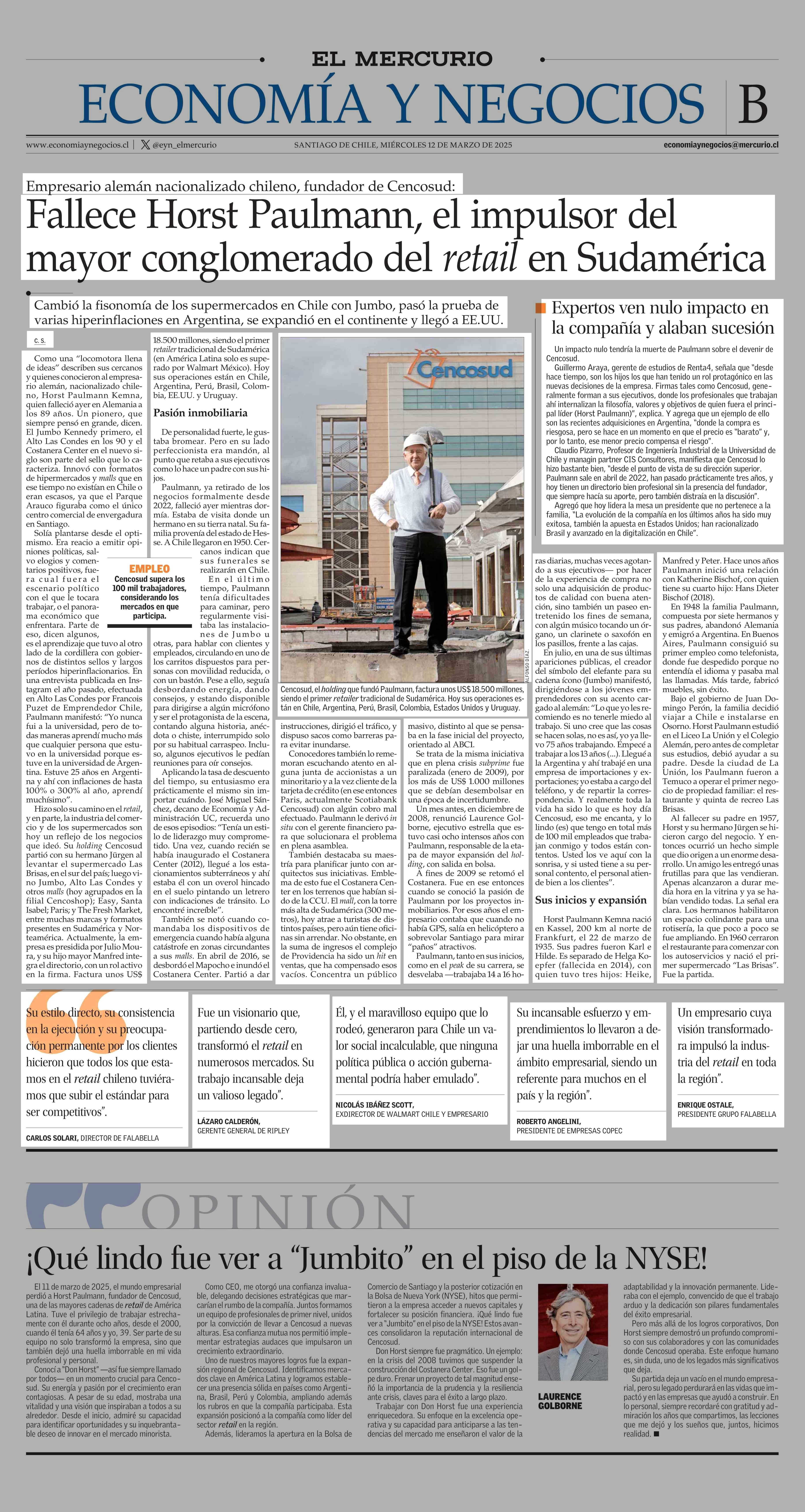 Fallece Horst Paulmann, el impulsor del mayor conglomerado del retail en Sudamérica 12-03-2025 El Mercurio |