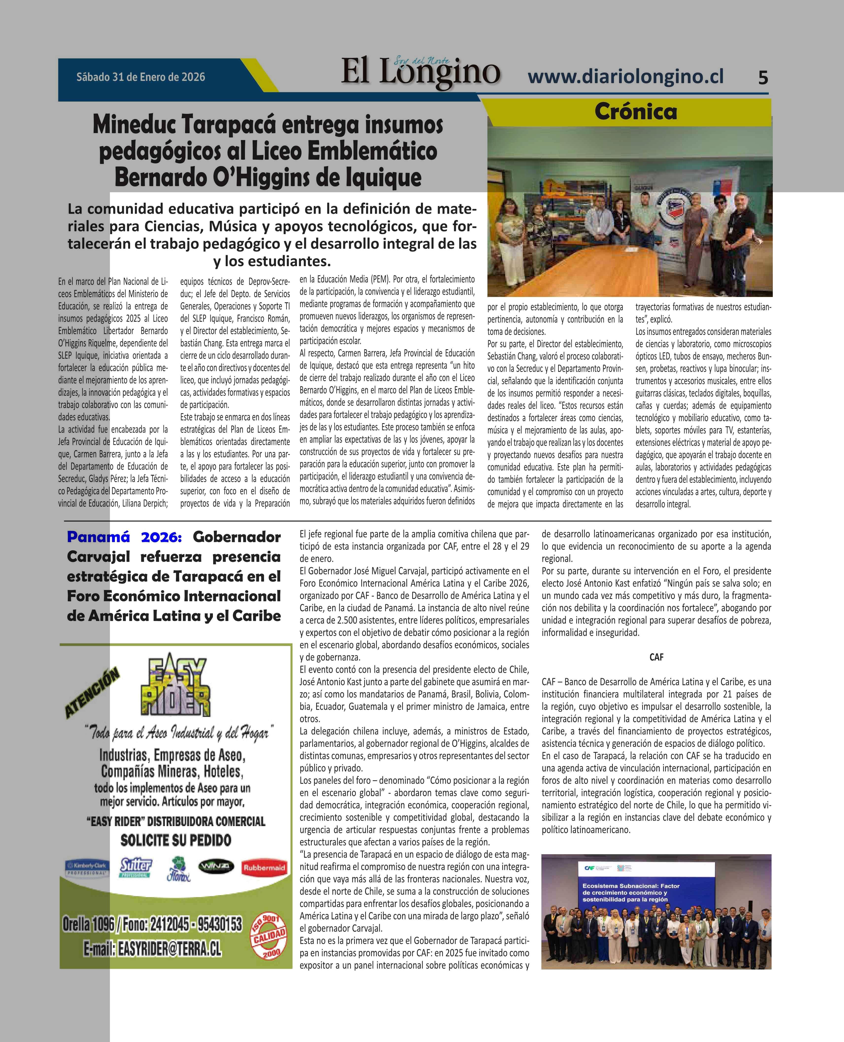 Mineduc Tarapacá entrega insumos pedagógicos al Liceo Emblemático Bernardo O'Higgins de Iquique 31-01-2026 El Longino |