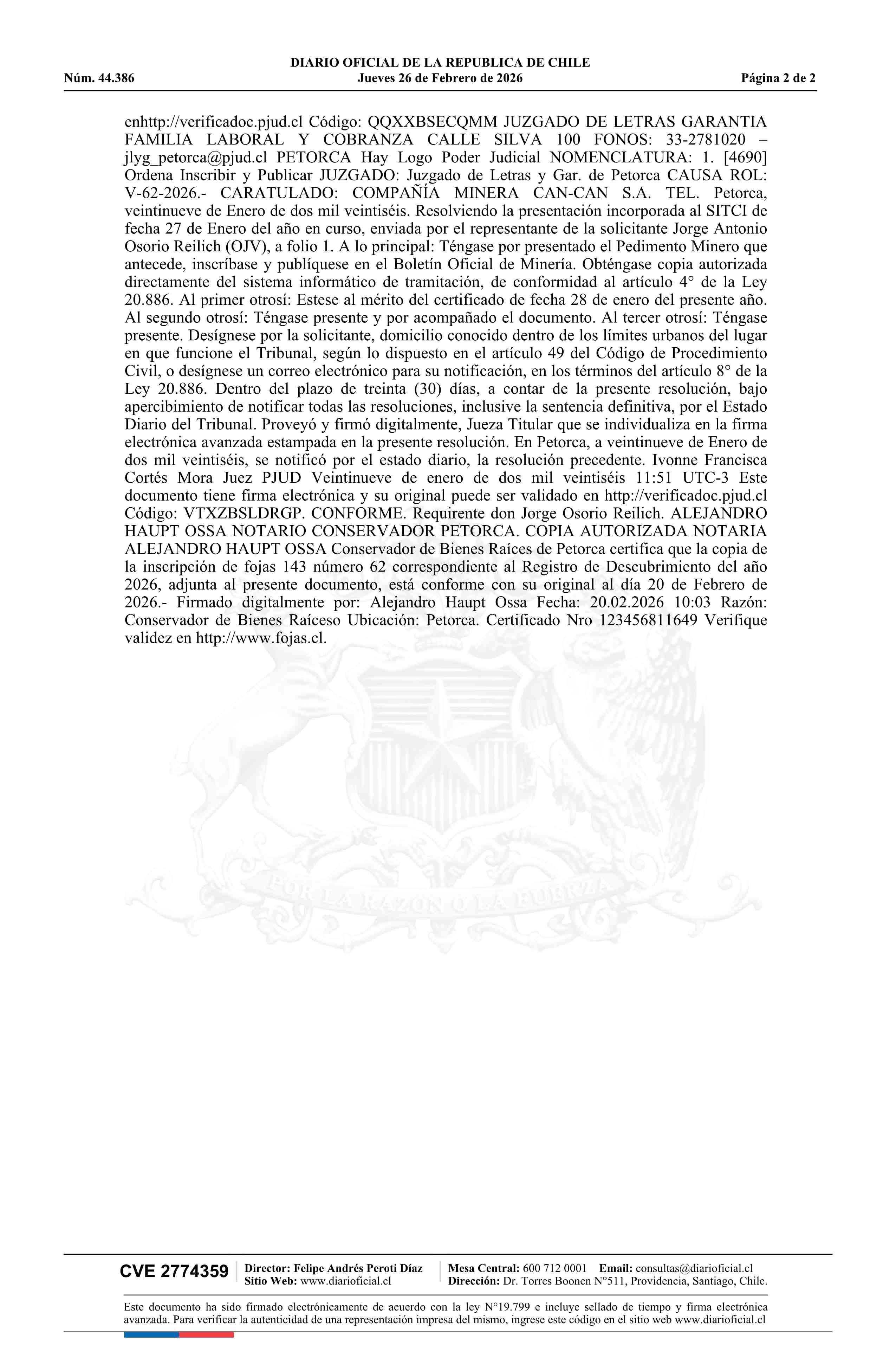 IGNACIA 16A / Compañía Minera Can-Can S.A. 26-02-2026 DIARIO OFICIAL CHILE - BOLETÍN OFICIAL DE MINERÍA |