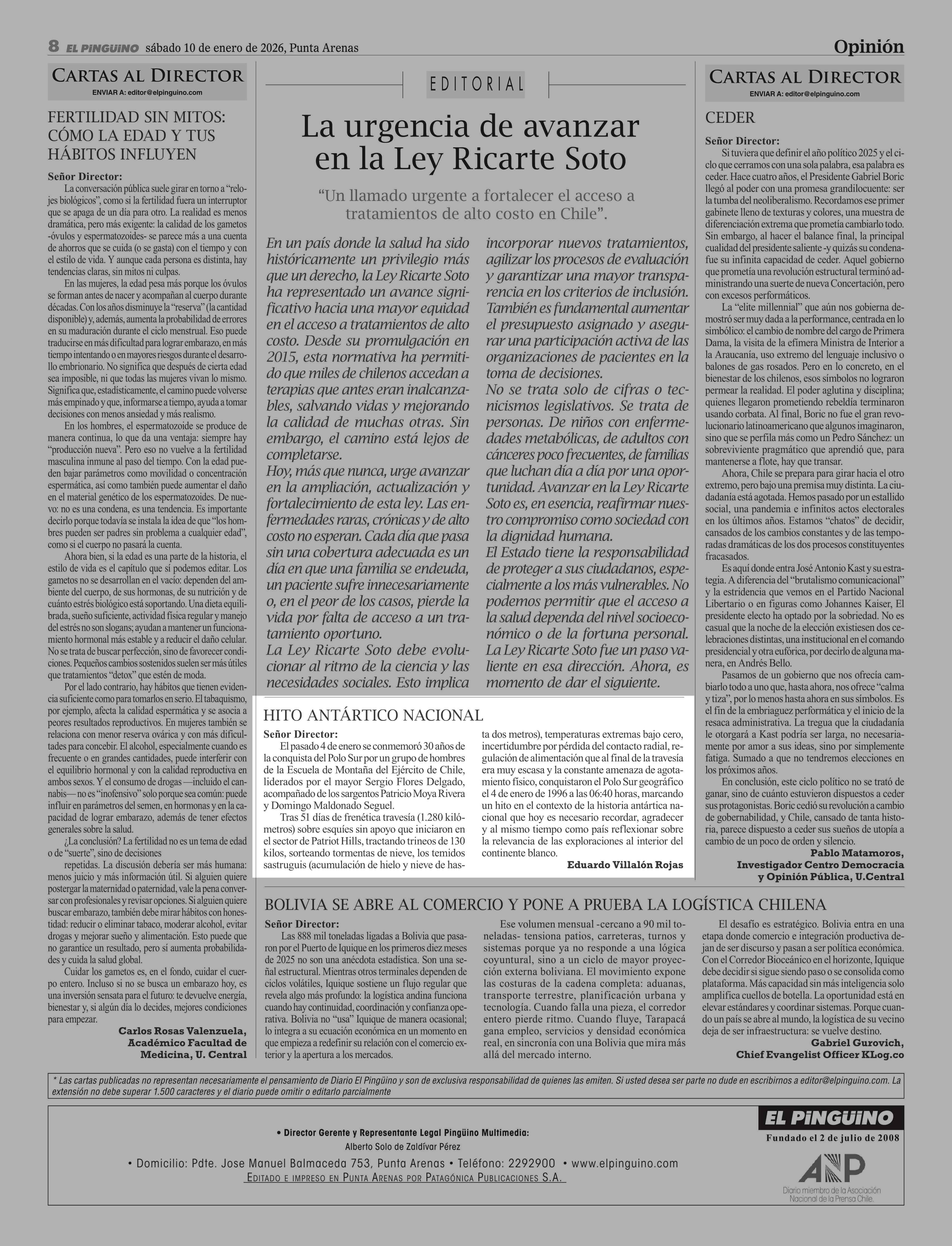 | Título: | Cartas: Señor Director: El pasado 4 de enero se conmemoró 30 años de la conquista del Polo Sur por un grupo de hombres de la Escuela de Montaña del Ejército de Chile, liderados por el mayor Sergio Flores Delgado, acompañado de los sargentos Patricio Moya Rivera y Domingo Maldonado Seguel. Tras 51 dí |