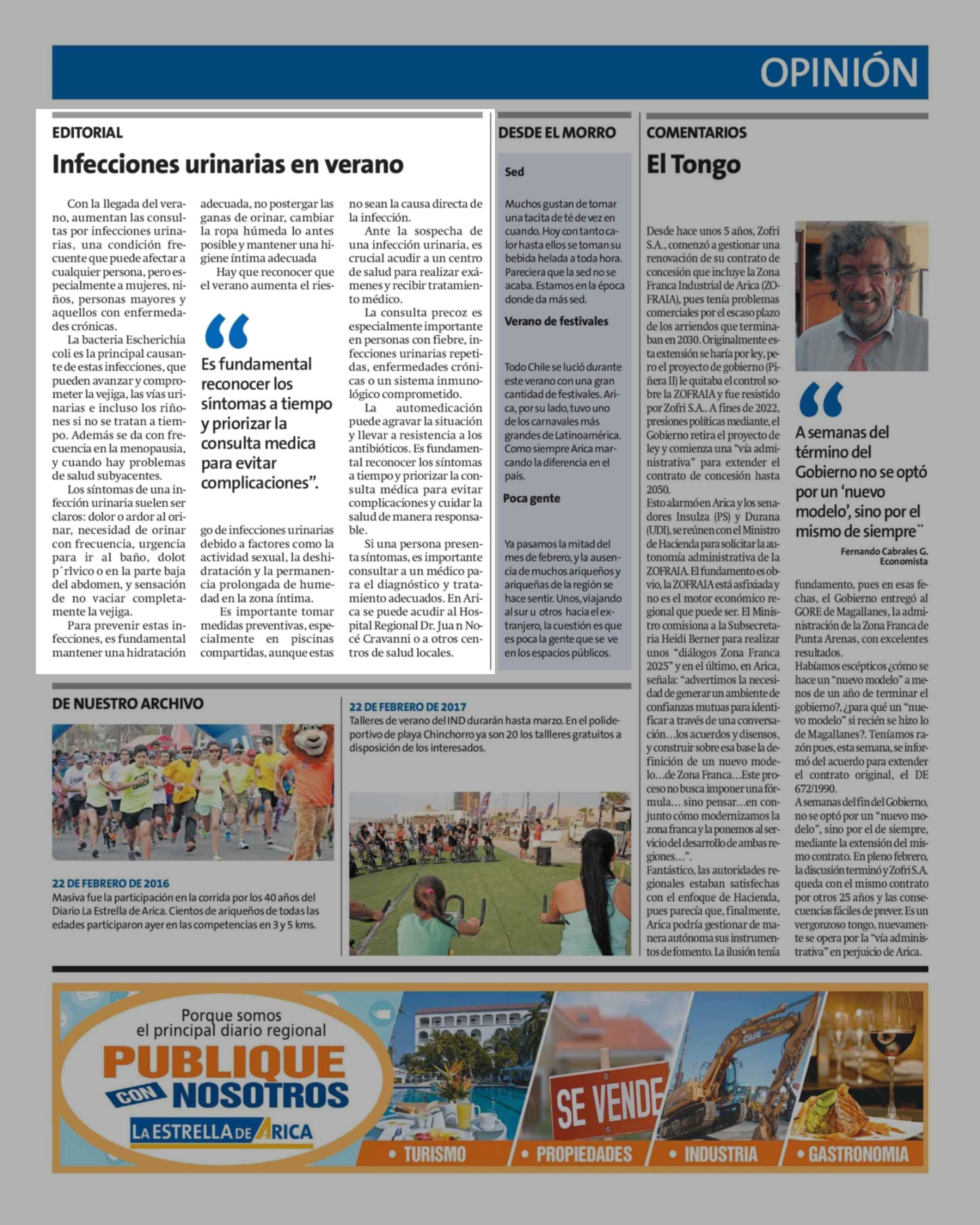 Editorial: Infecciones urinarias en verano 22-02-2026 La Estrella de Arica |