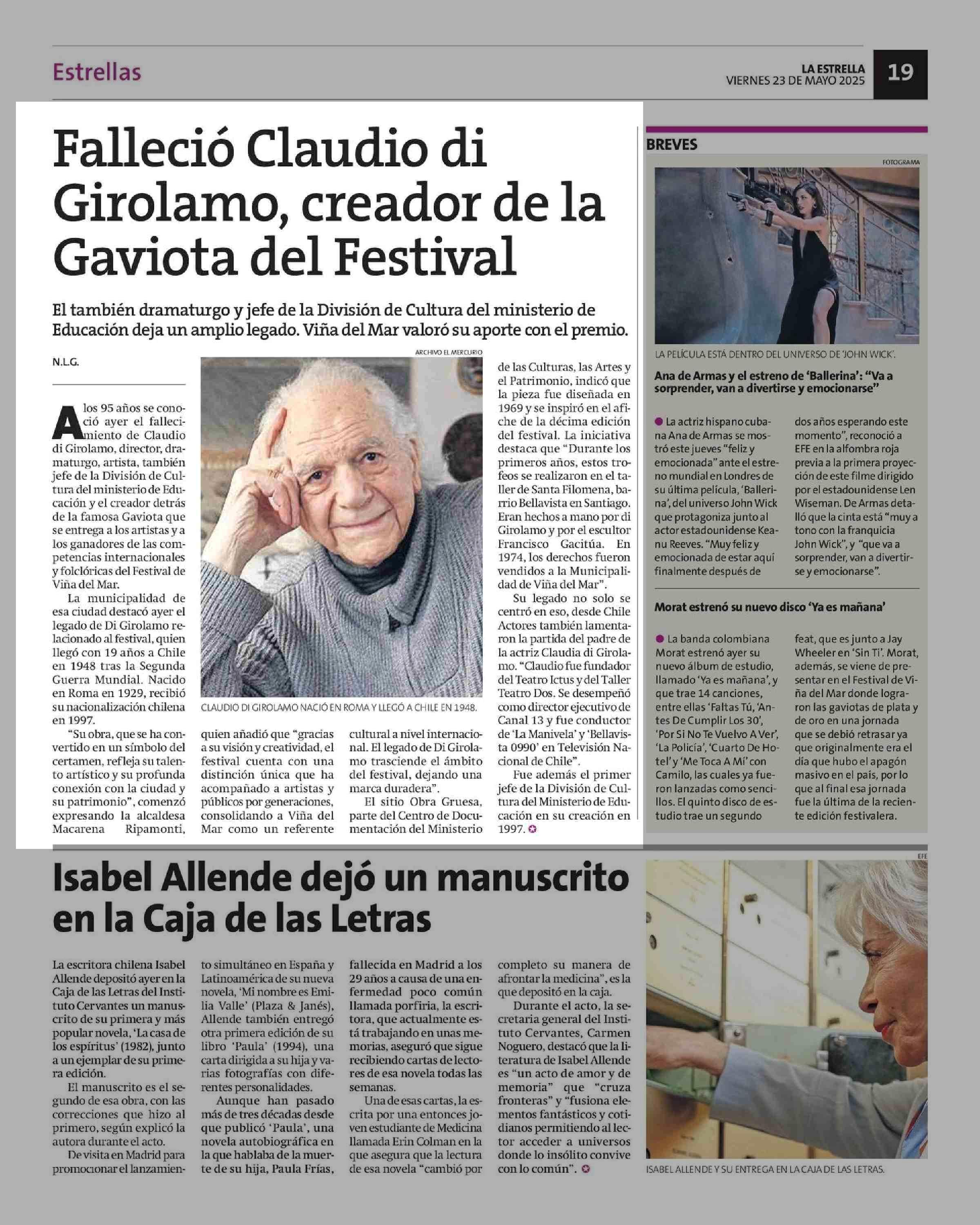 Falleció Claudio di Girolamo, creador de la Gaviota del Festival 23-05-2025 La Estrella de Concepción |