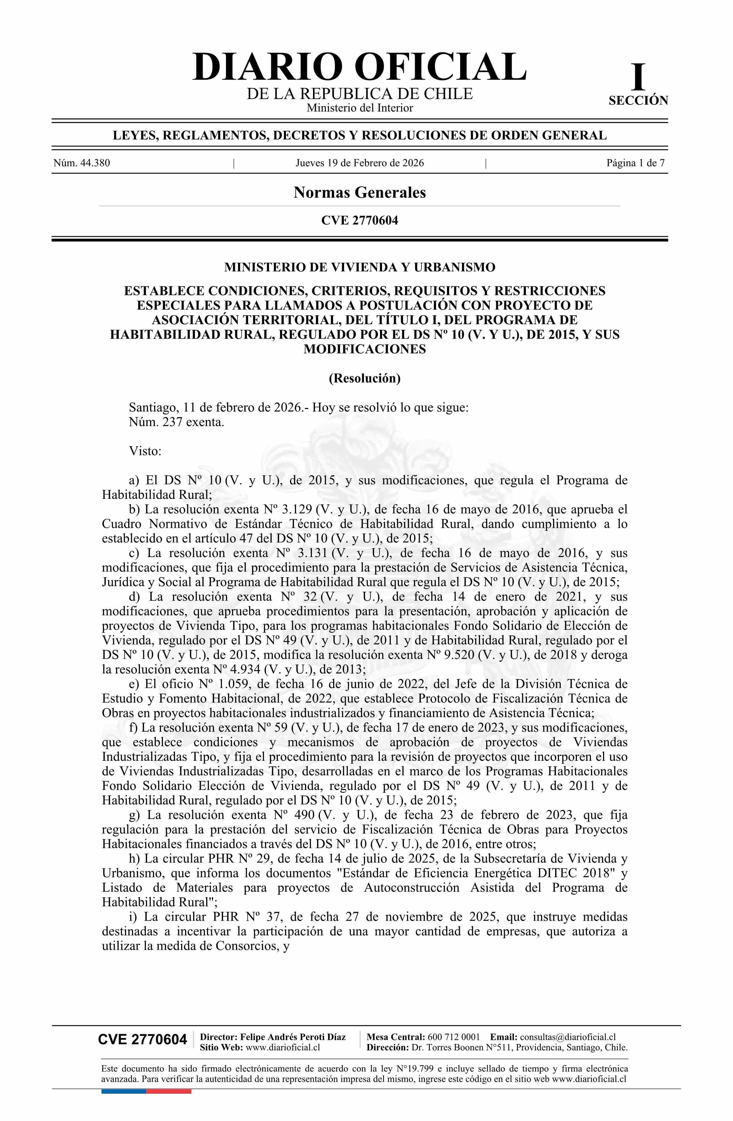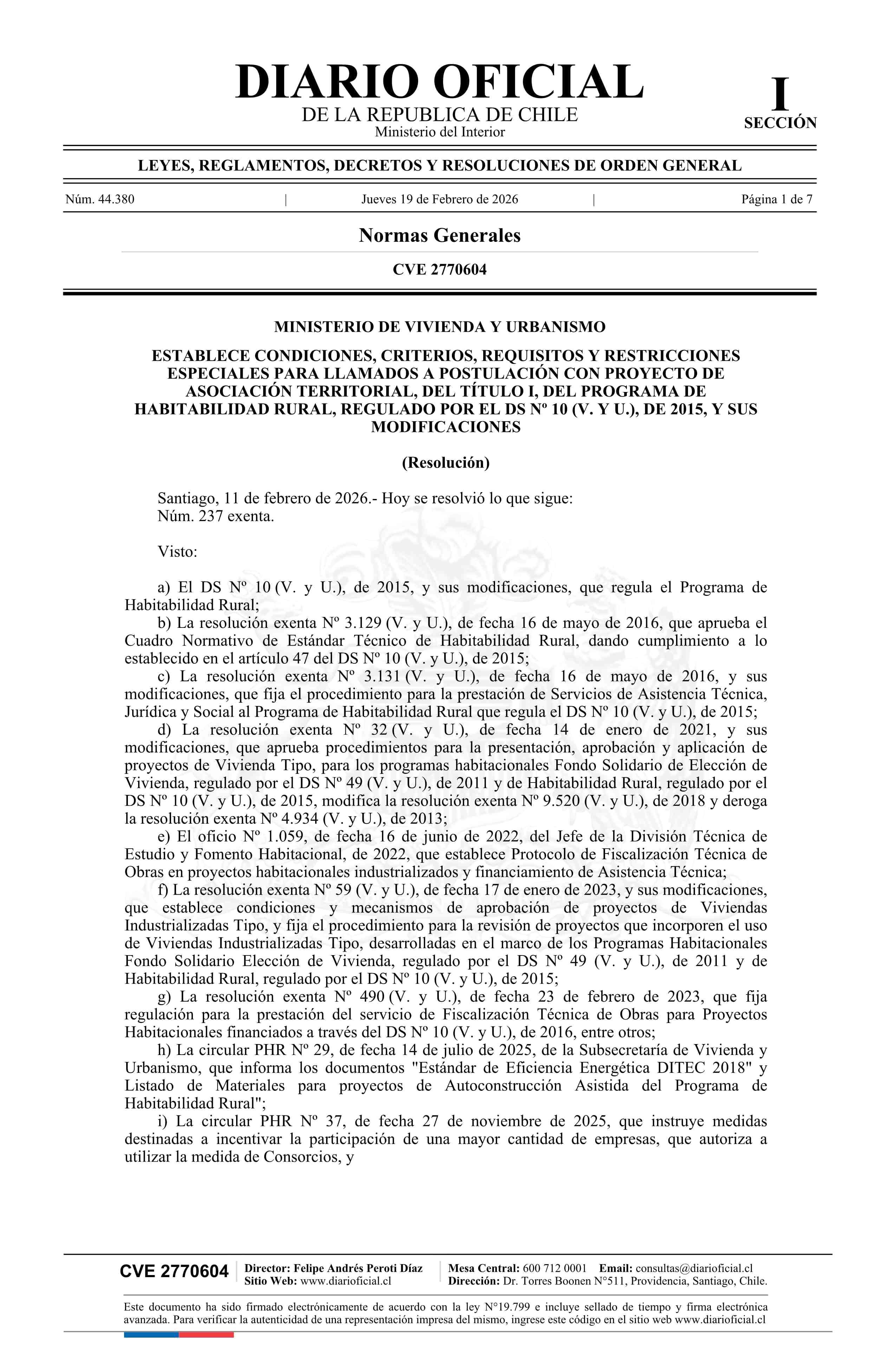 Título: Resolución exenta número 237, de 2026.- Establece condiciones, criterios, requisitos y restricciones especiales para llamados a postulación con Proyecto de Asociación Territorial, del Título I, del Programa de Habitabilidad Rural, regulado por el decreto Nº 10 de 2015, y sus modificaciones