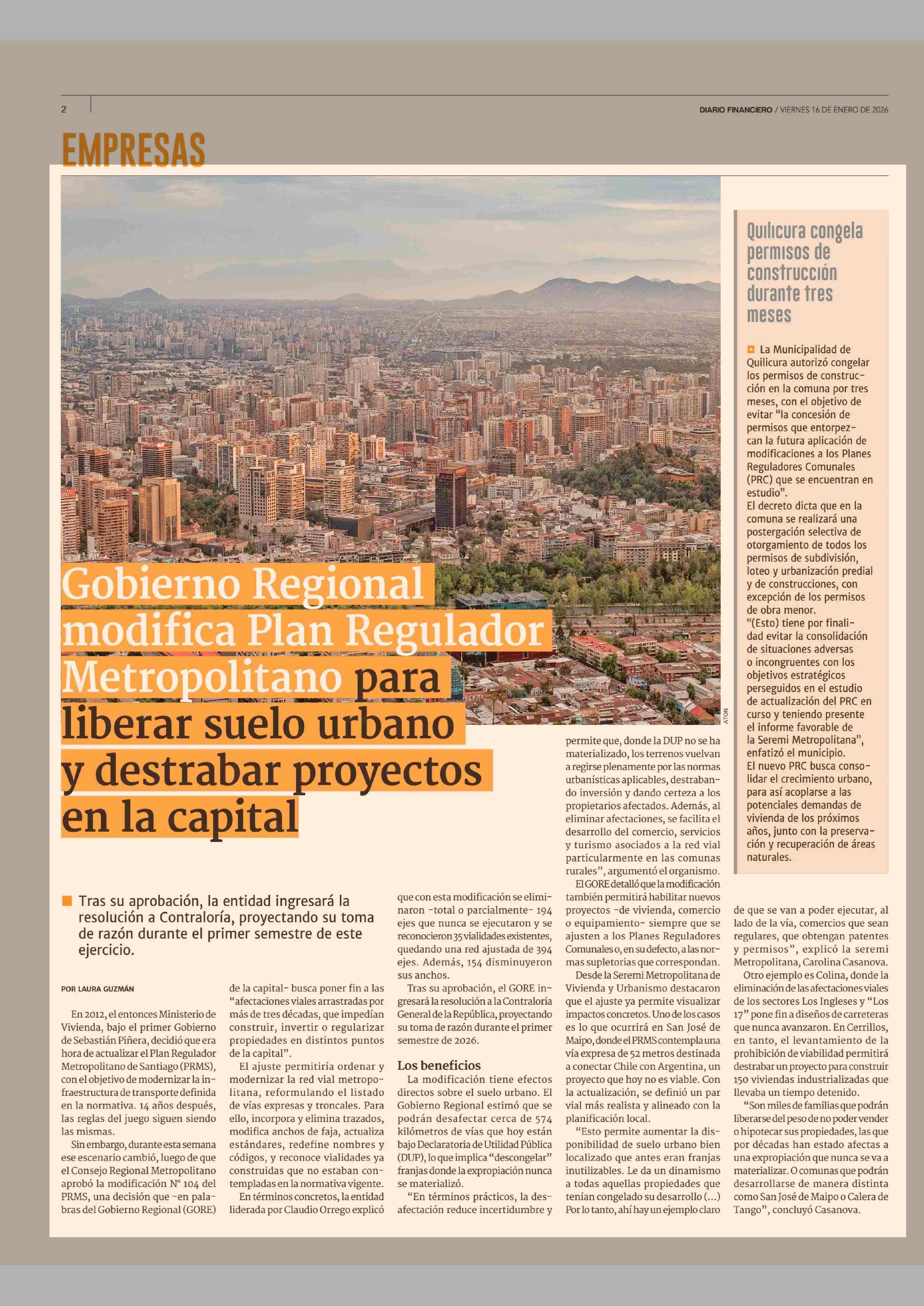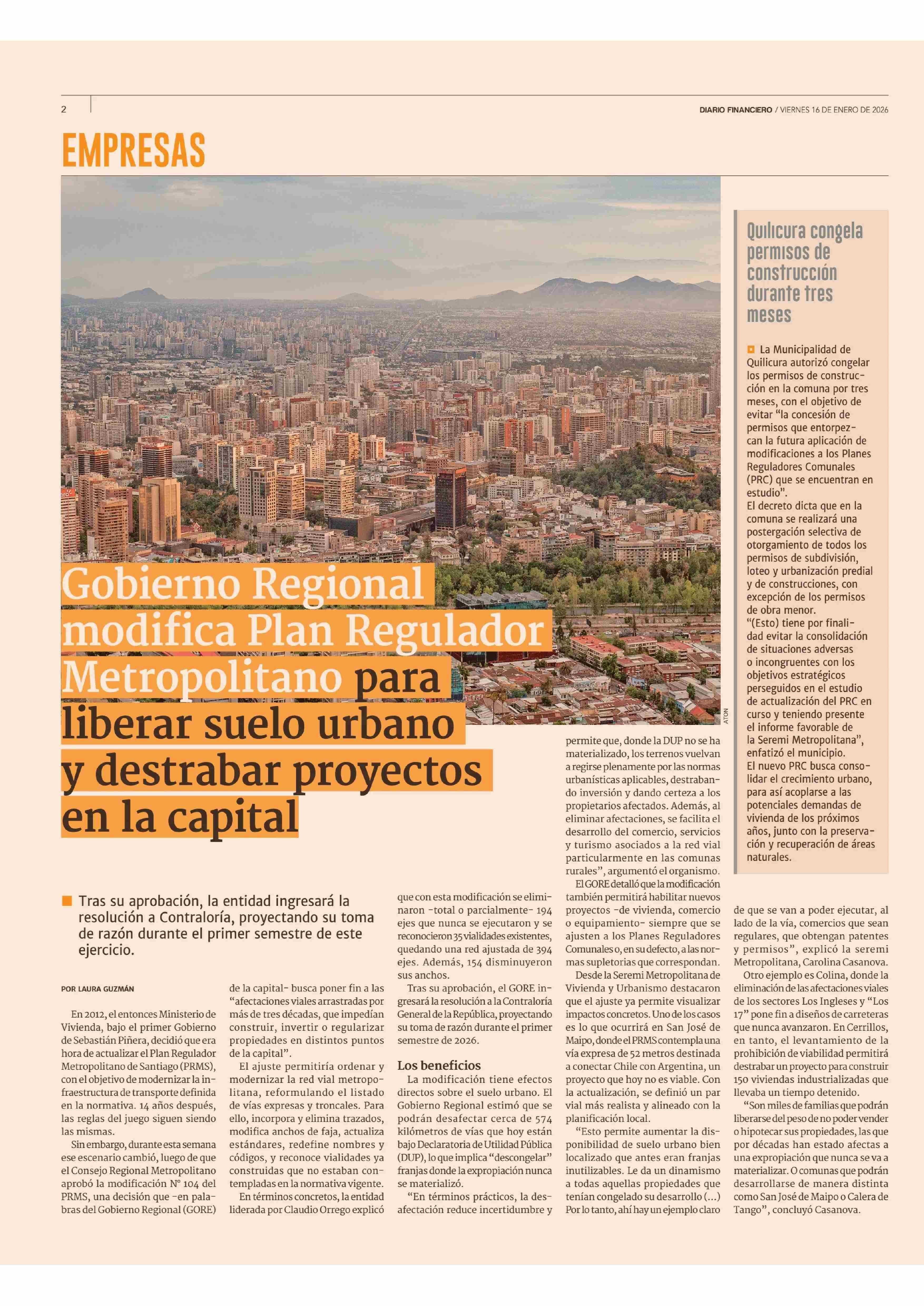Gobierno Regional modifica Plan Regulador Metropolitano para liberar suelo urbano y destrabar proyectos en la capital 16-01-2026 Diario Financiero |