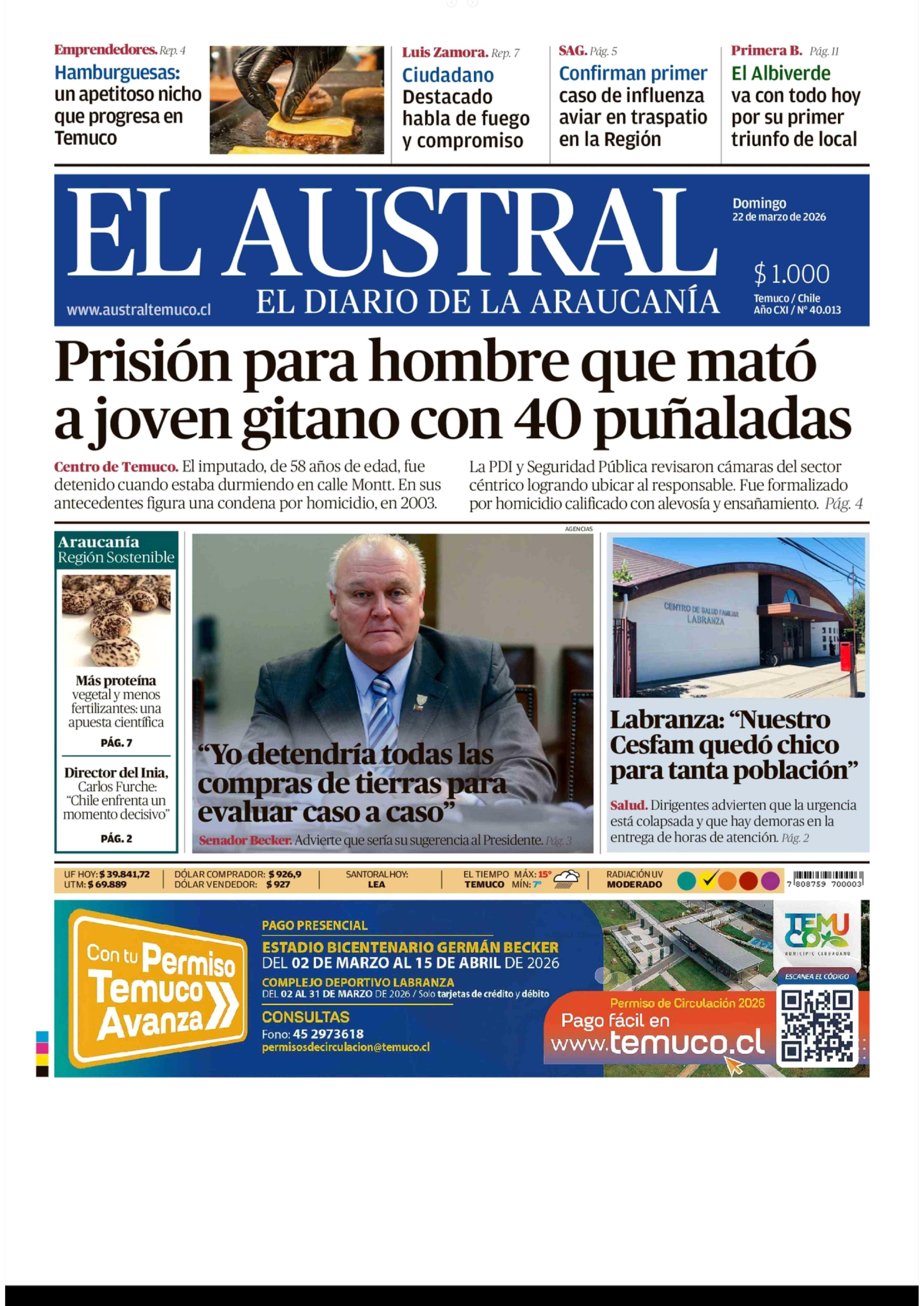 | Fecha: | 22-03-2026 | Sector: | Portada | Región: | Región de la Araucanía |