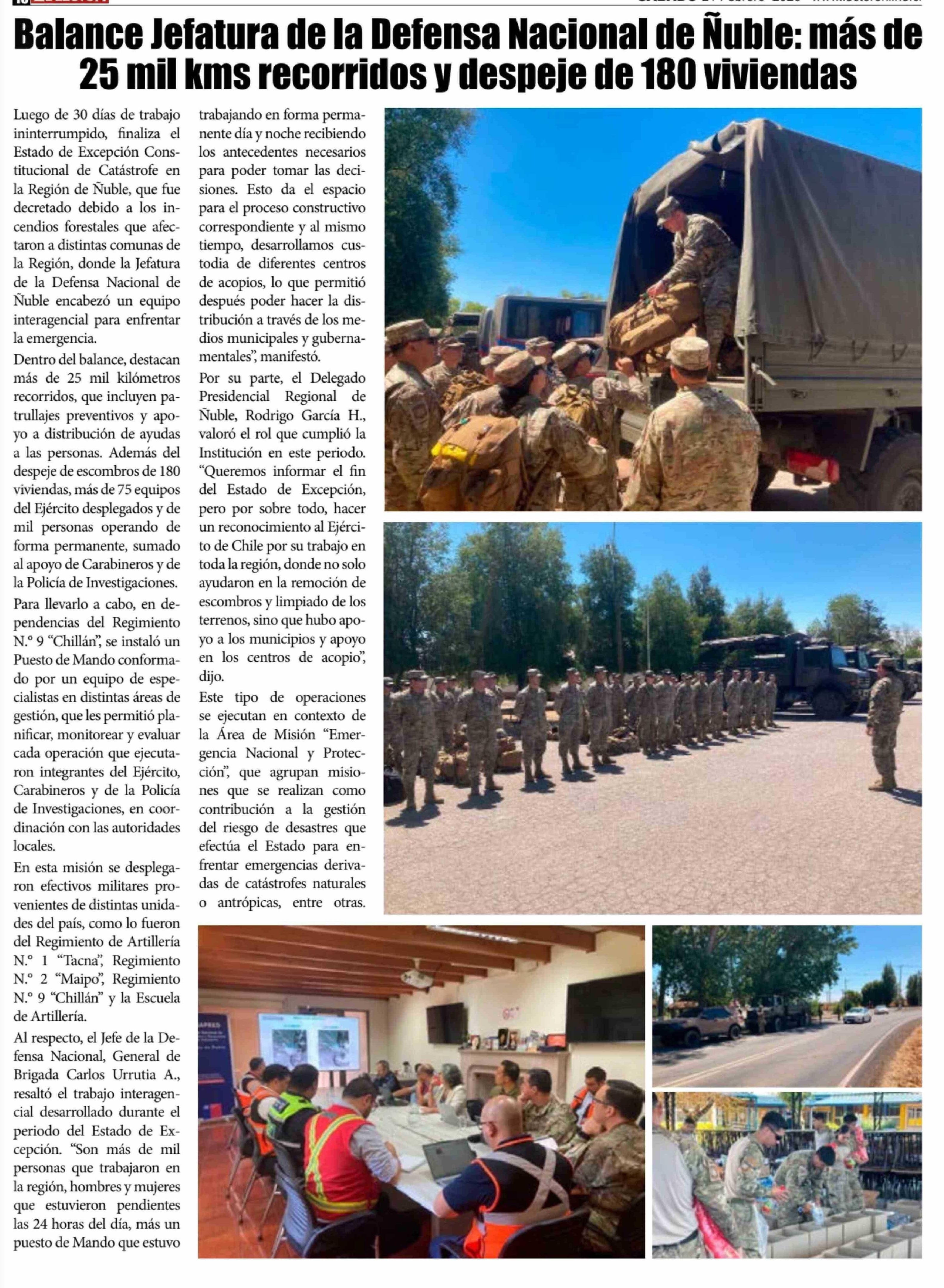 Balance Jefatura de la Defensa Nacional de Ñuble: más de 25 mil kms recorridos y despeje de 180 viviendas 21-02-2026 El Lector |