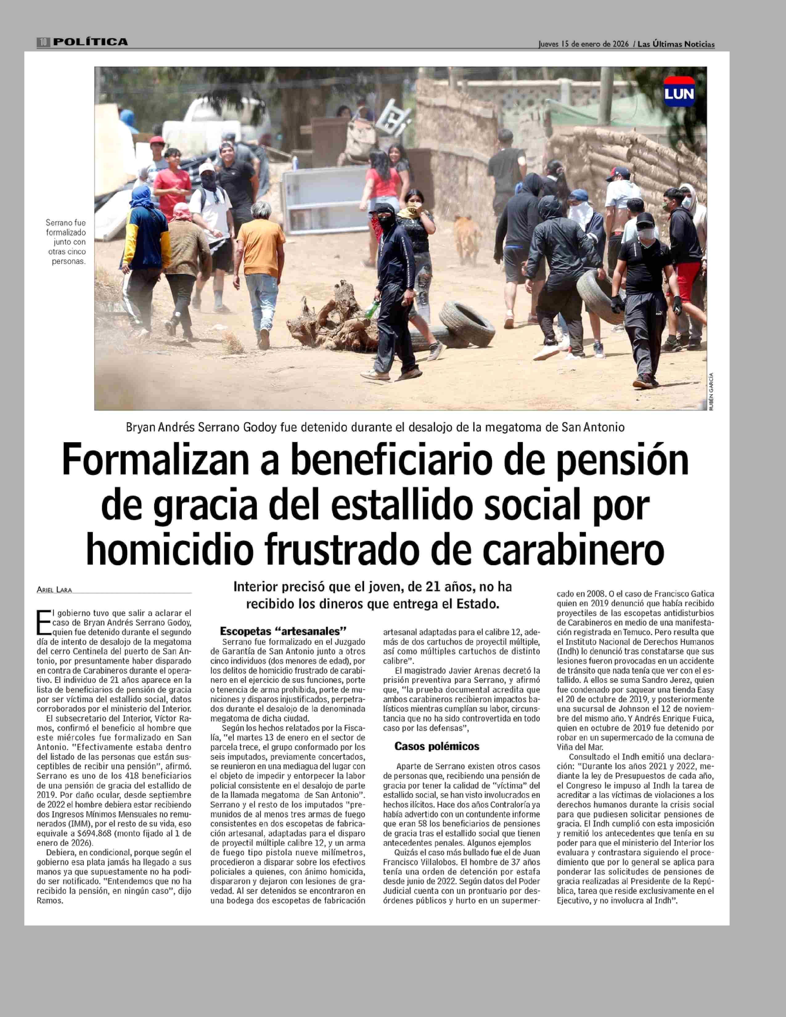 Formalizan a beneficiario de pensión de gracia del estallido social por homicidio frustrado de carabinero 15-01-2026 Las Últimas Noticias |