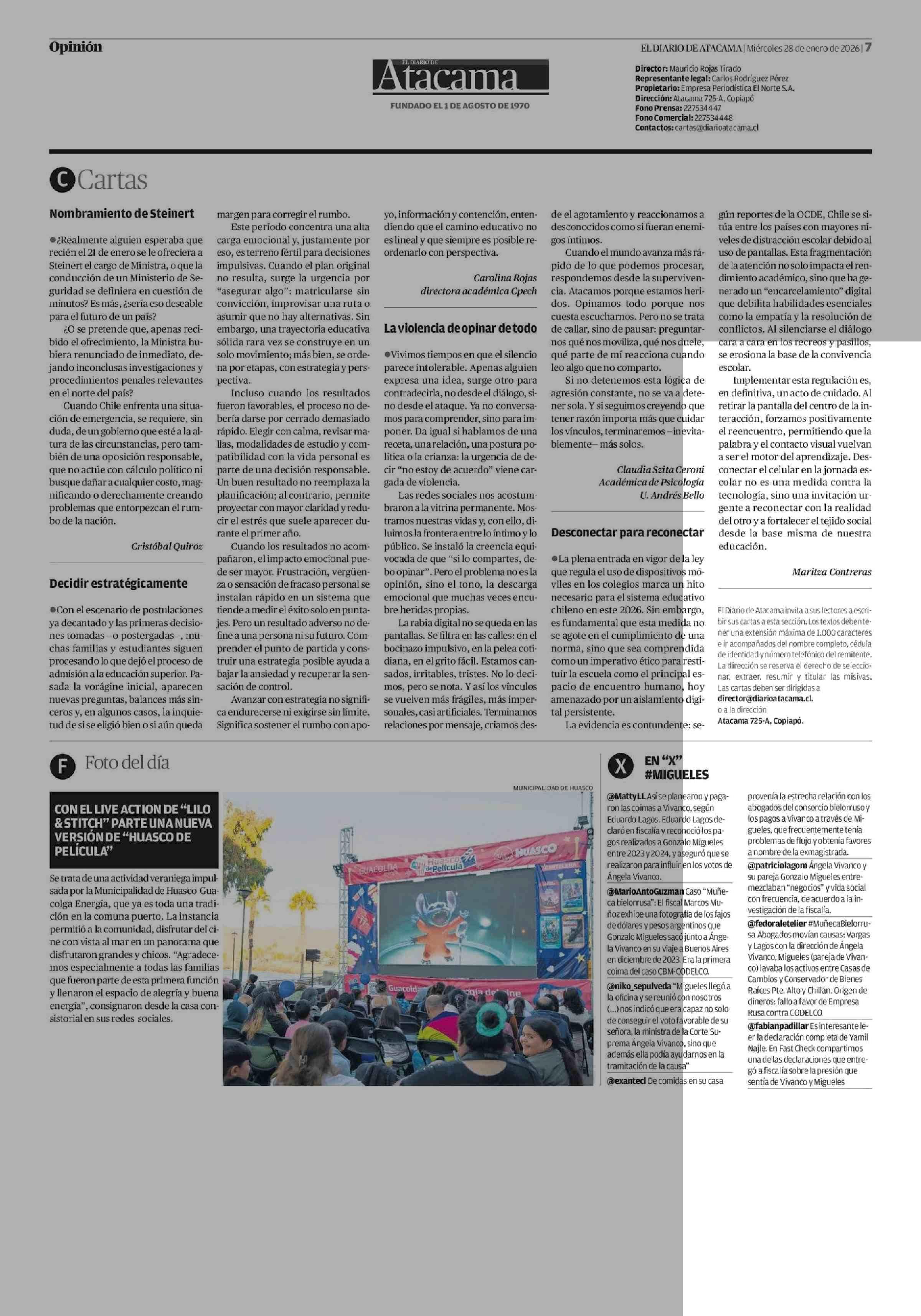 CARTAS: La violencia de opinar de todo 28-01-2026 El Diario de Atacama |