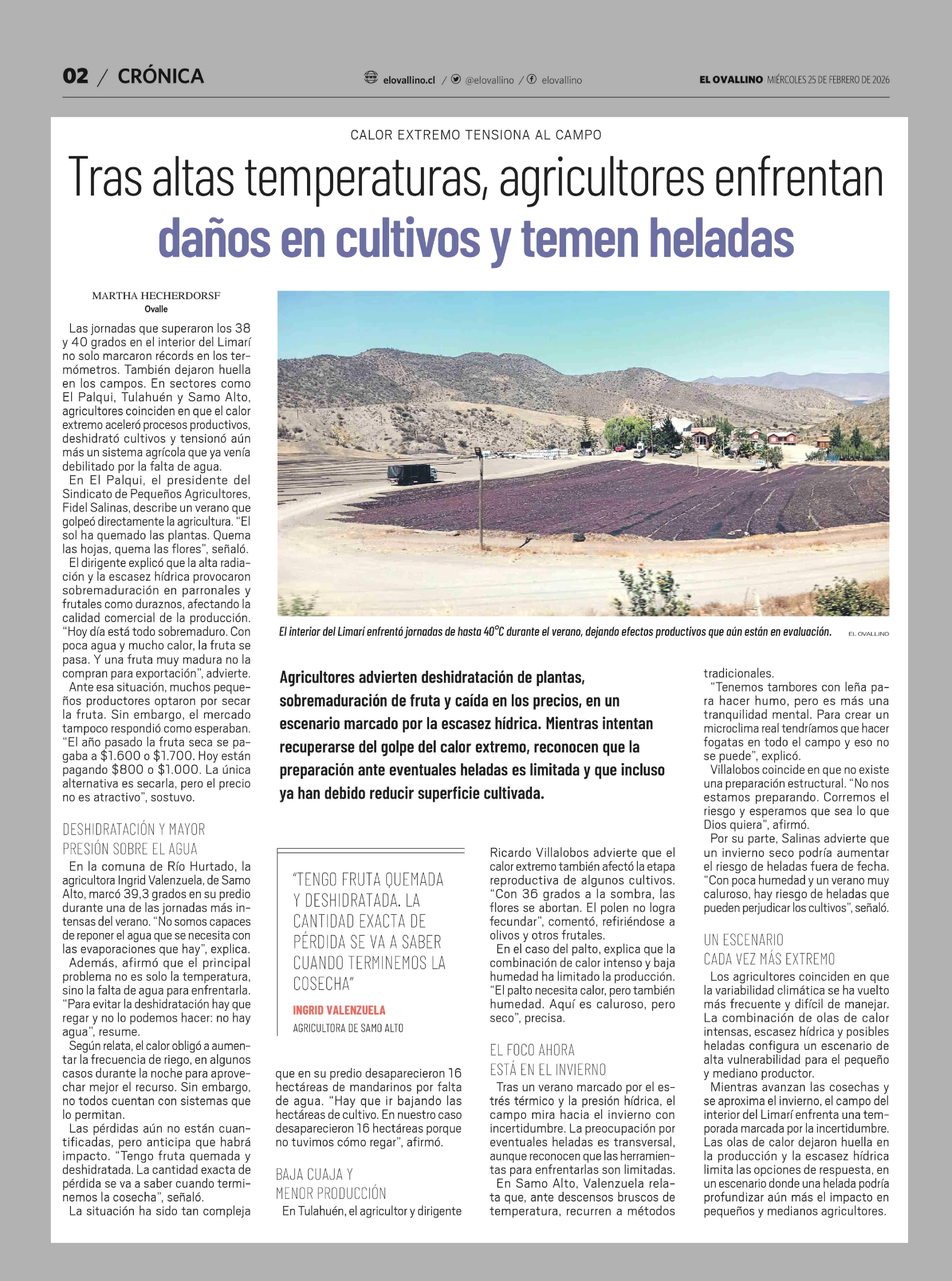 Tras altas temperaturas, agricultores enfrentan daños en cultivos y temen heladas 25-02-2026 El Ovallino |