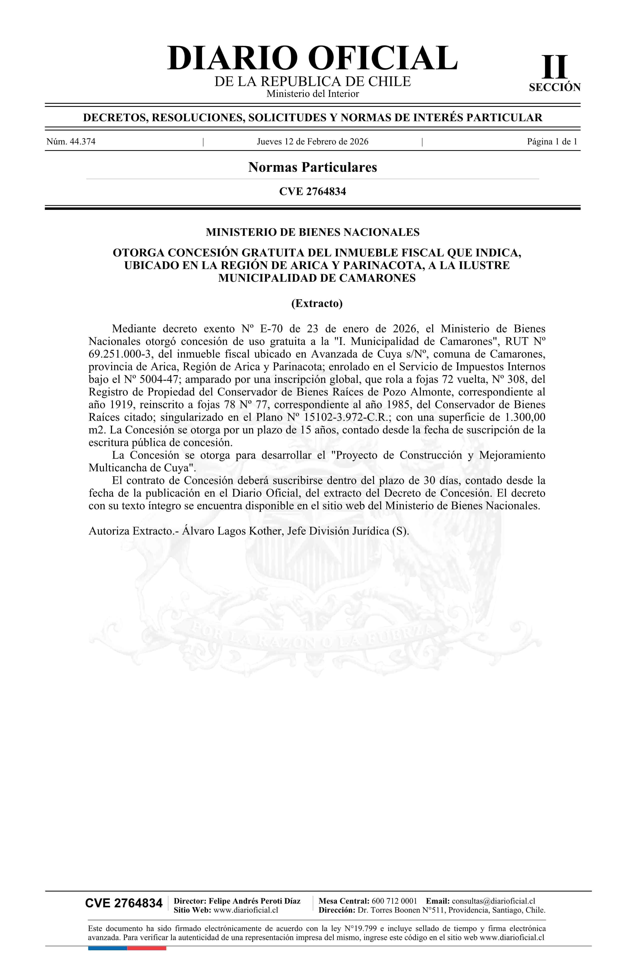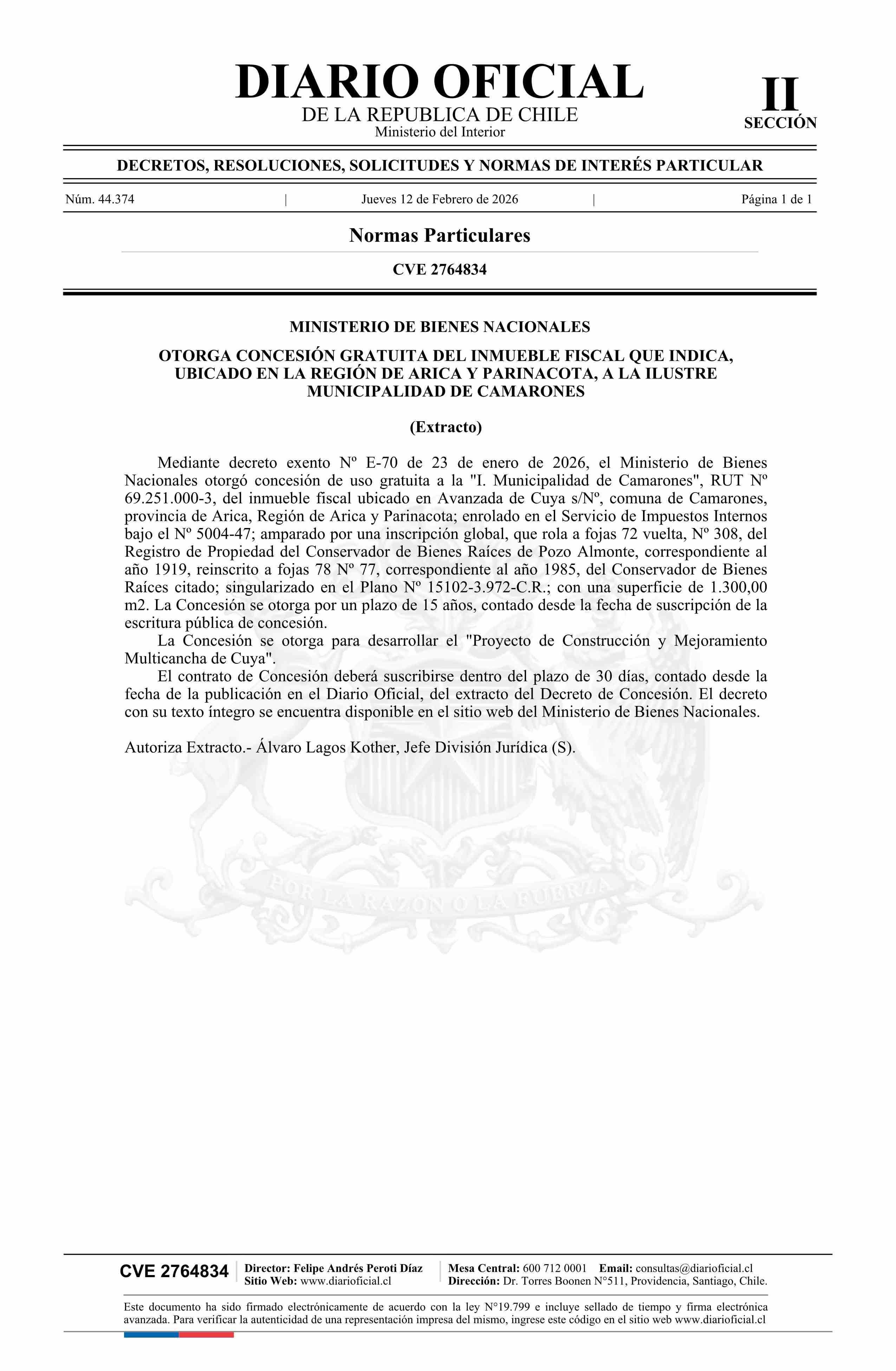| Título: | Extracto de decreto exento número E-70, de 2026.- Otorga concesión gratuita del inmueble fiscal que indica, ubicado en la Región de Arica y Parinacota, a la Municipalidad de Camarones |