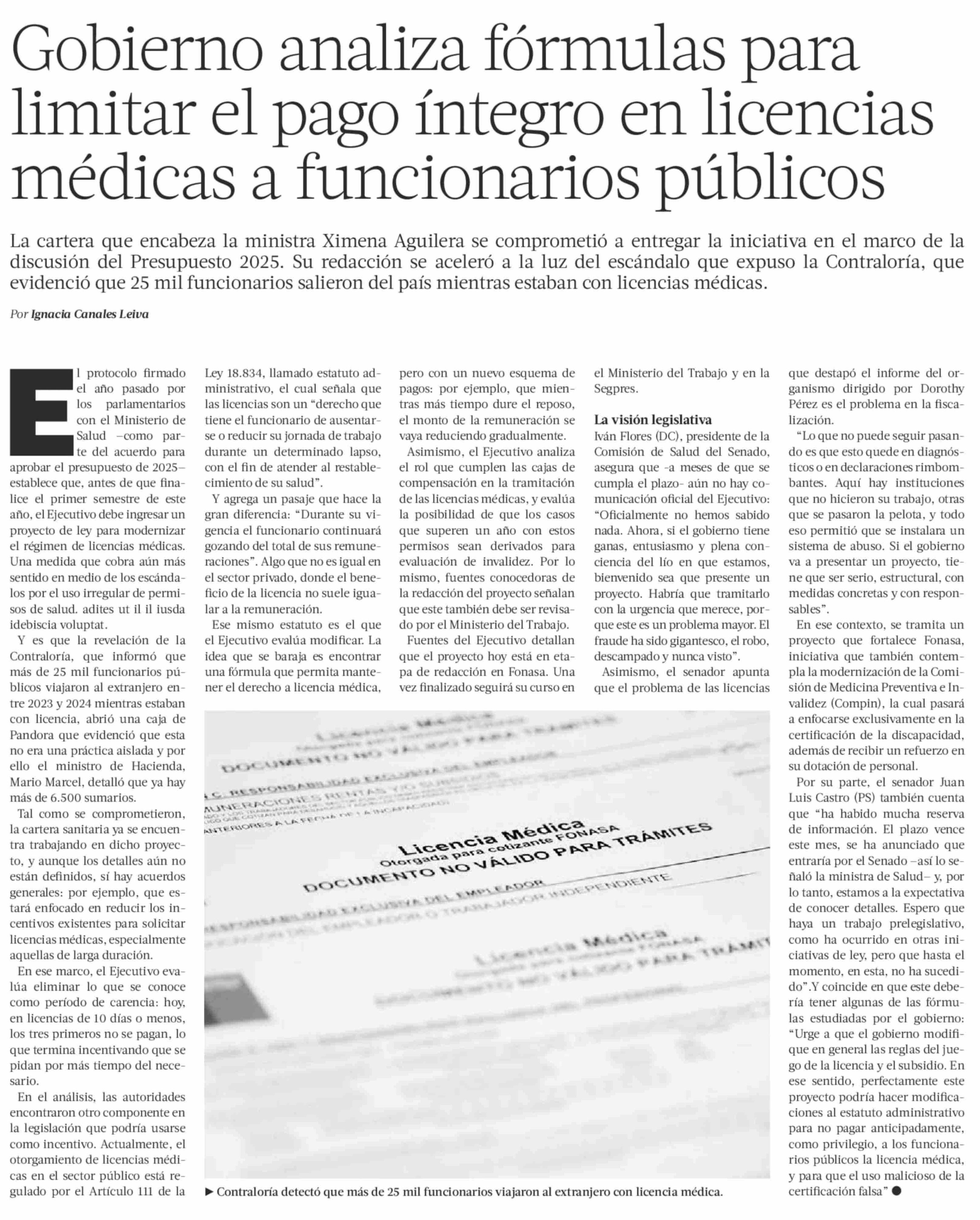 Gobierno analiza fórmulas para limitar el pago íntegro en licencias médicas a funcionarios públicos 07-06-2025 La Tercera |