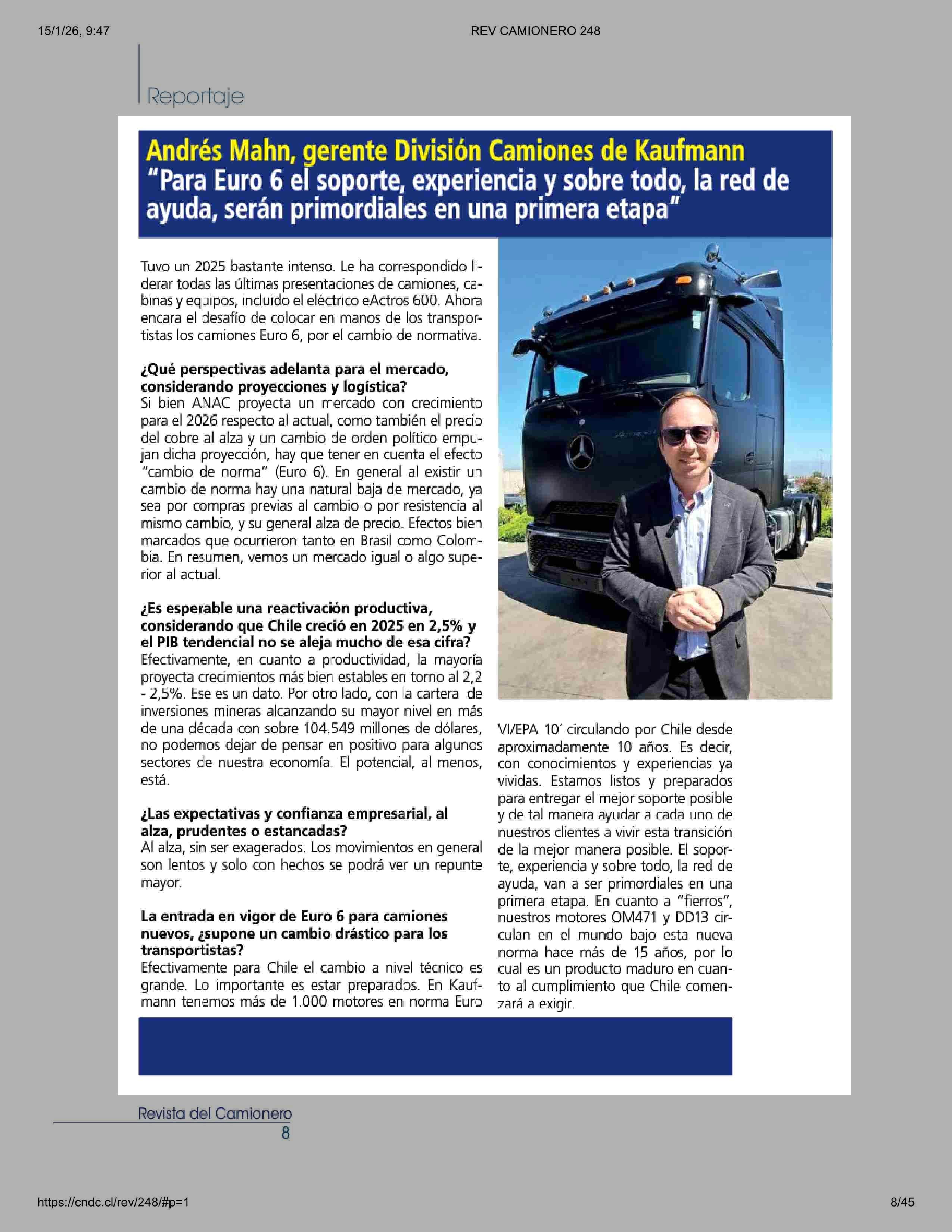 Andrés Mahn, gerente División Camiones de Kaufmann "Para Euro 6 el soporte, experiencia y sobre todo, la red de ayuda, serán primordiales en una primera etapa” 15-01-2026 Revista Del Camionero |