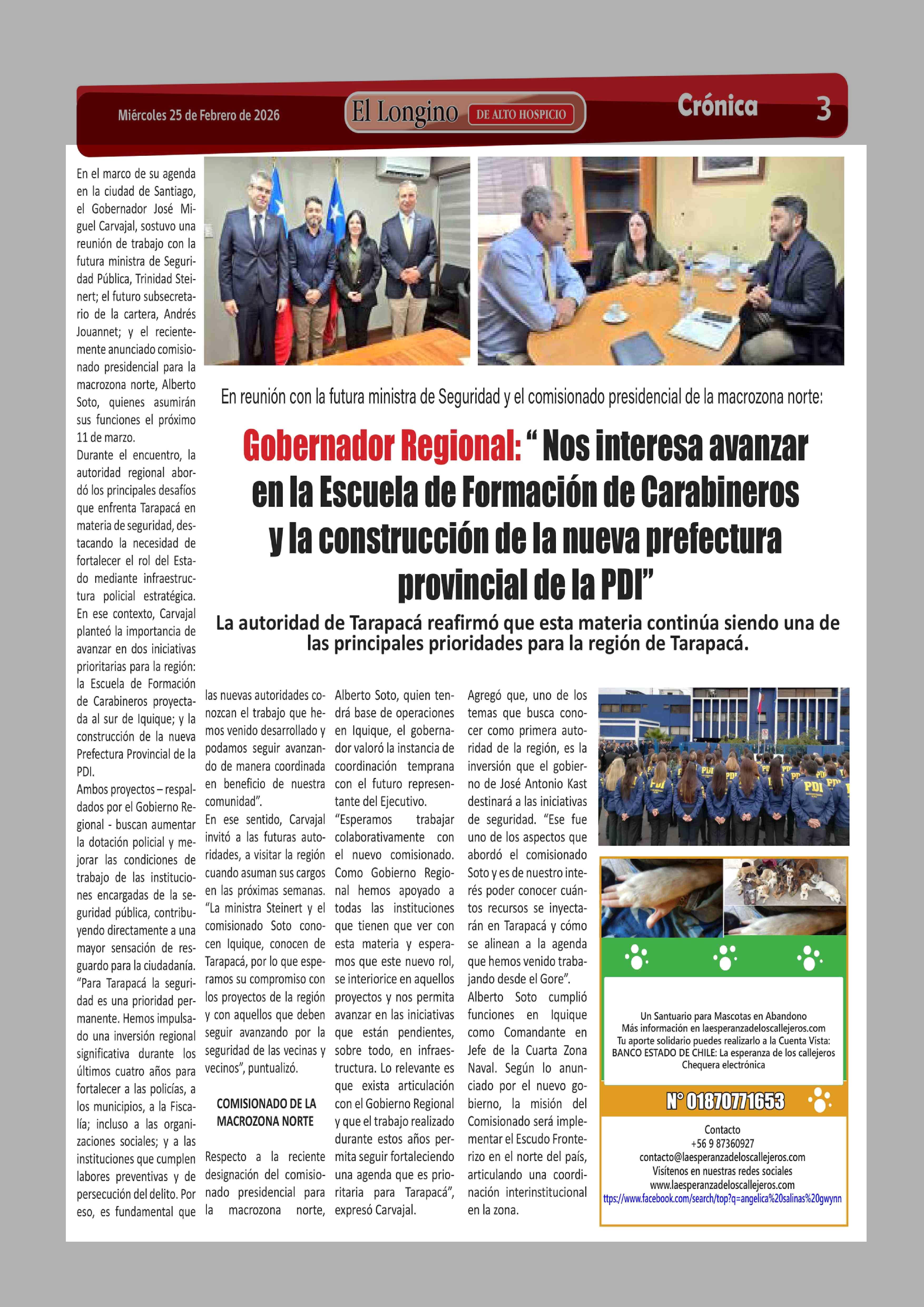 Gobernador Regional: " Nos interesa avanzar en la Escuela de Formación de Carabineros y la construcción de la nueva prefectura provincial de la PDI" 25-02-2026 El Longino |