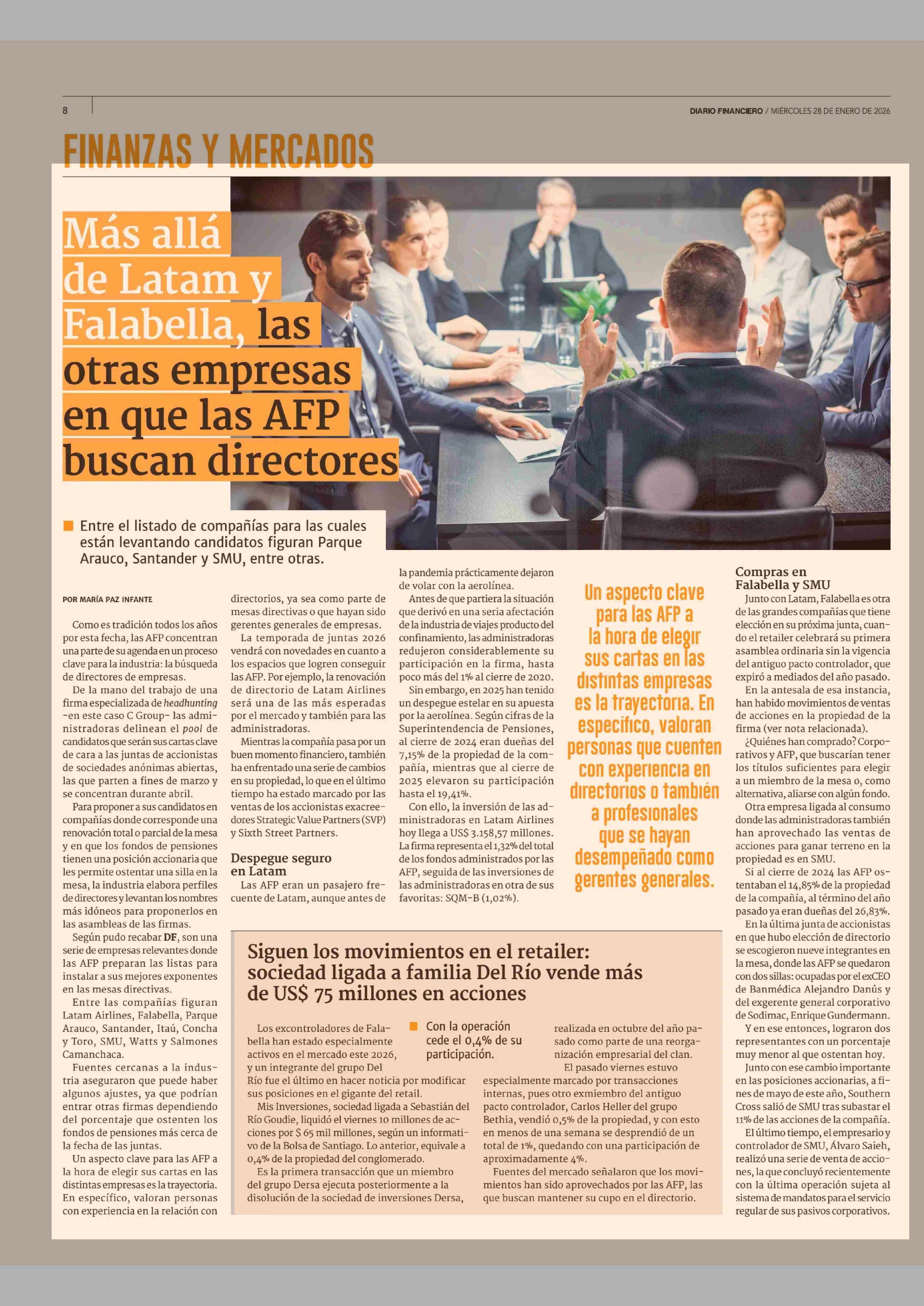 Más allá de Latam y Falabella, las otras empresas en que las AFP buscan directores 28-01-2026 Diario Financiero |