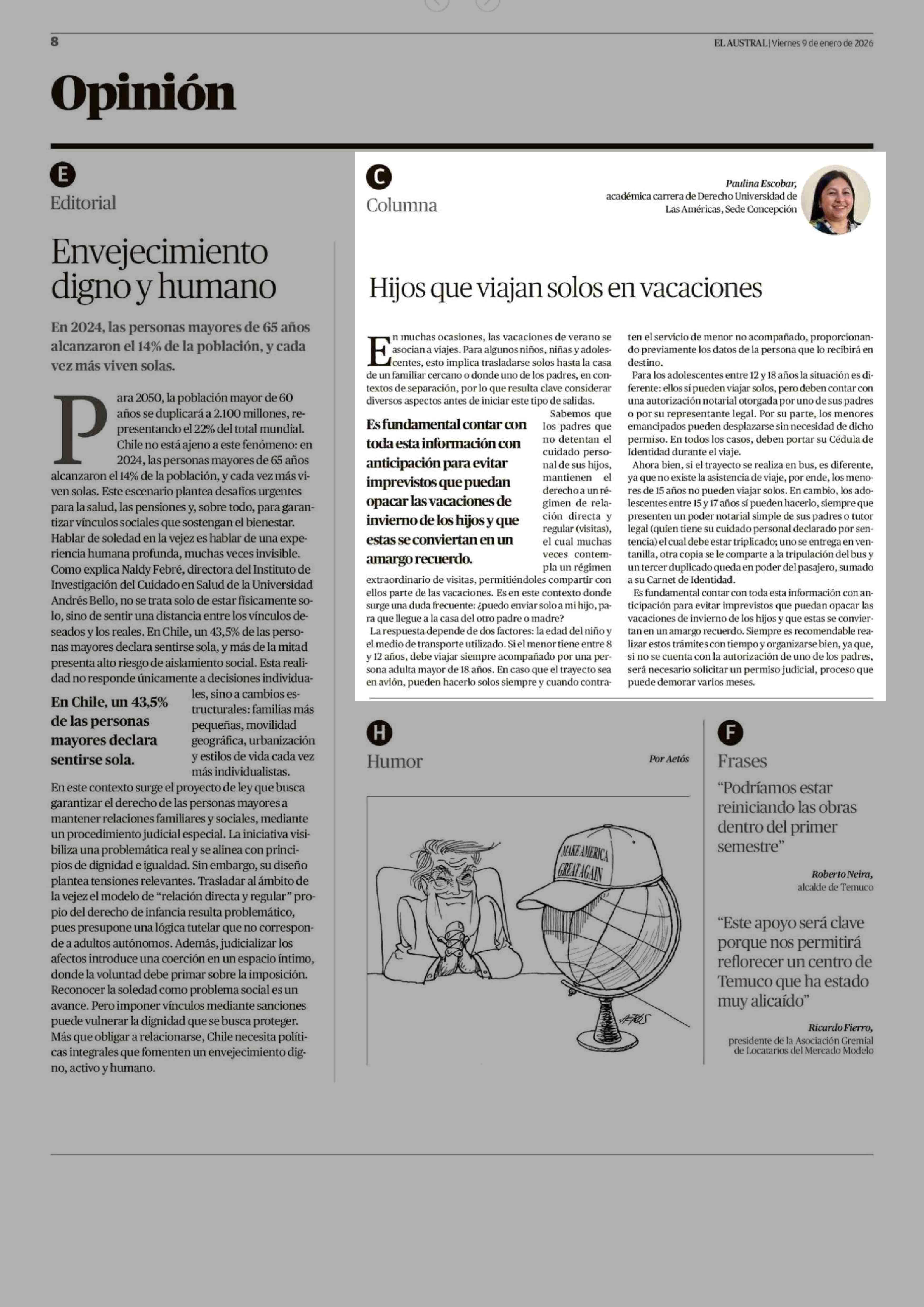 Columnas de Opinión: Hijos que viajan solos en vacaciones 09-01-2026 El Austral de la Araucanía |