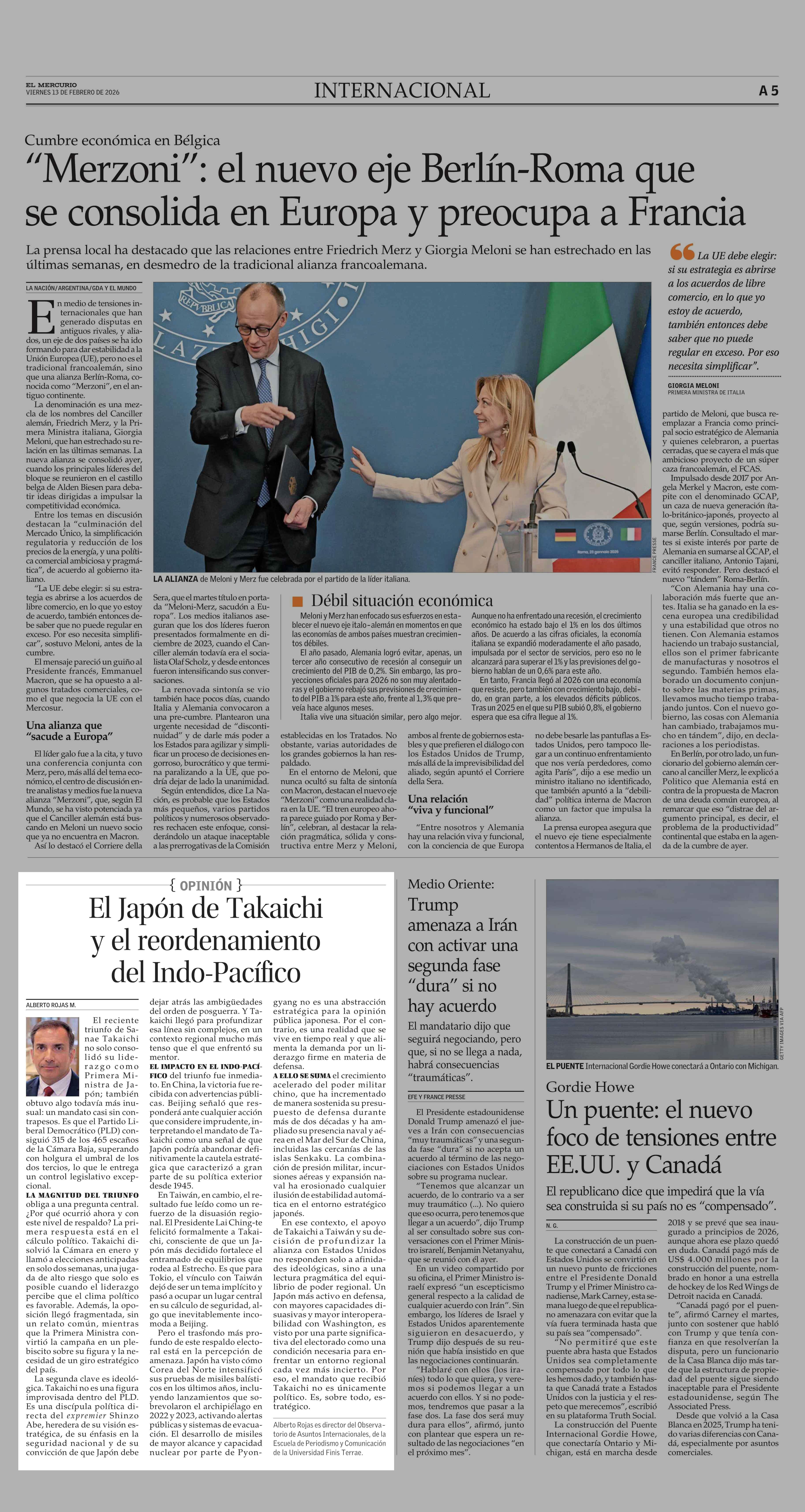 Columnas de Opinión: El Japón de Takaichi y el reordenamiento del Indo-Pacífico 13-02-2026 El Mercurio |