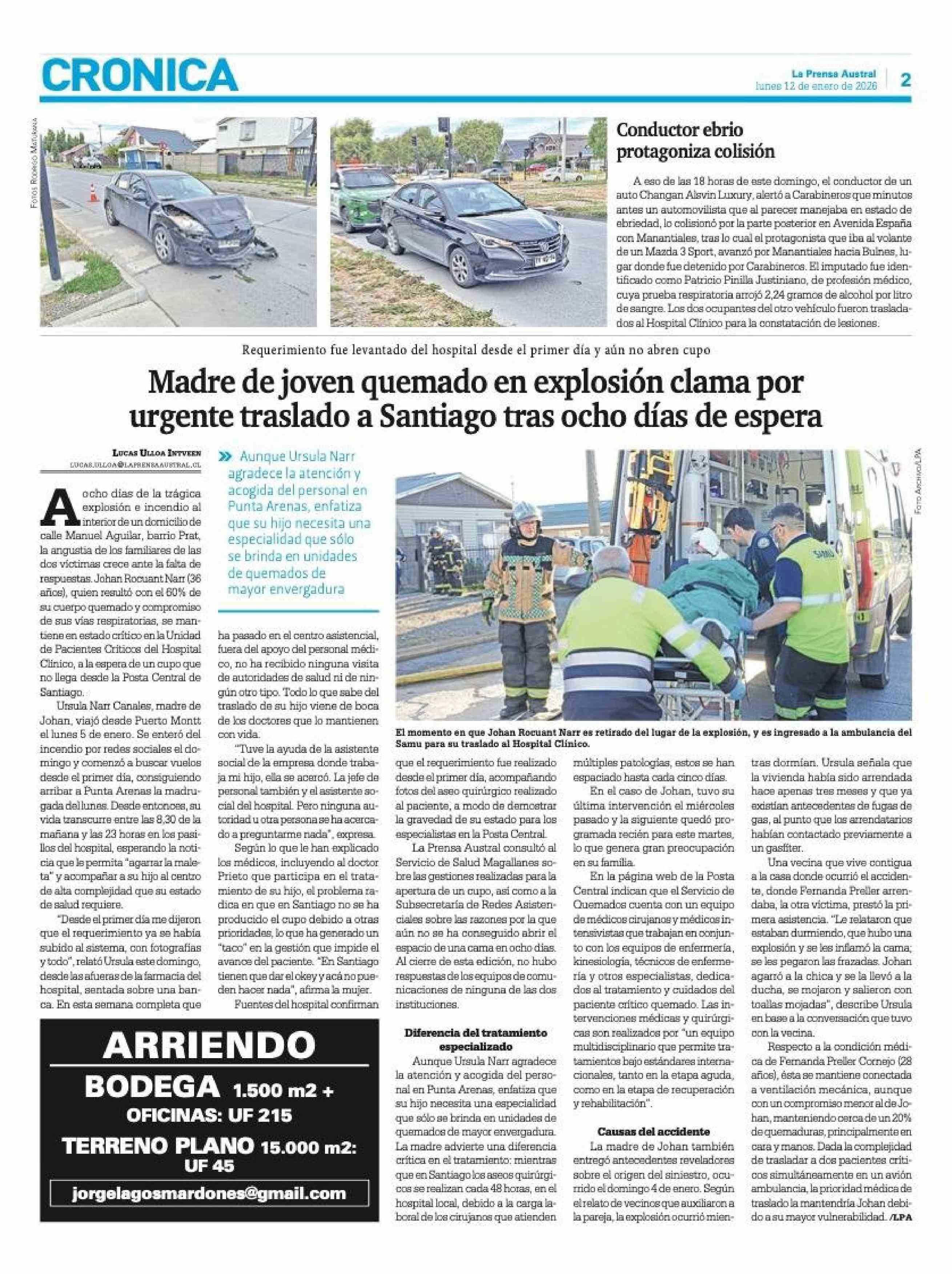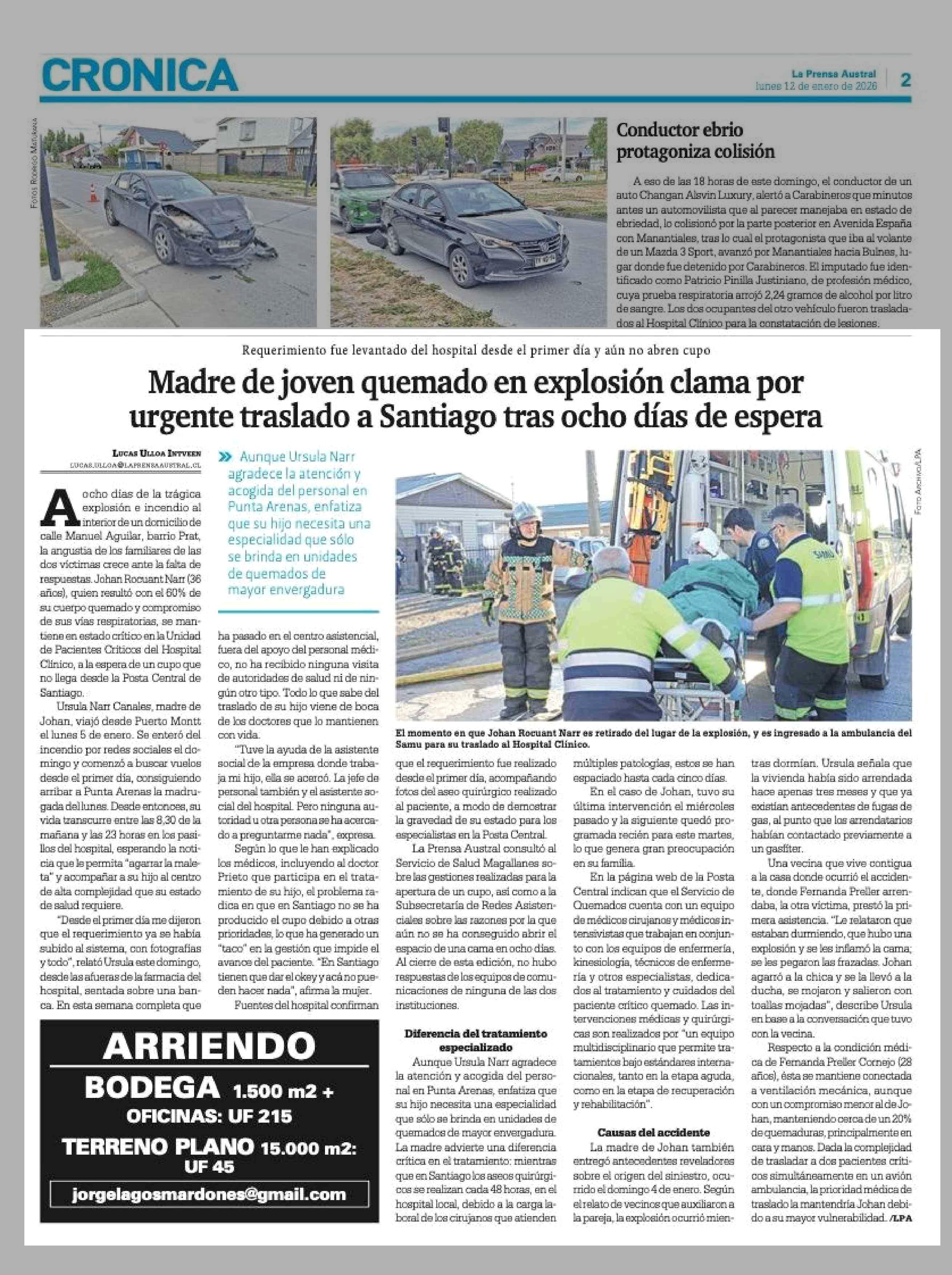 Madre de joven quemado en explosión clama por urgente traslado a Santiago tras ocho días de espera 12-01-2026 La Prensa Austral |